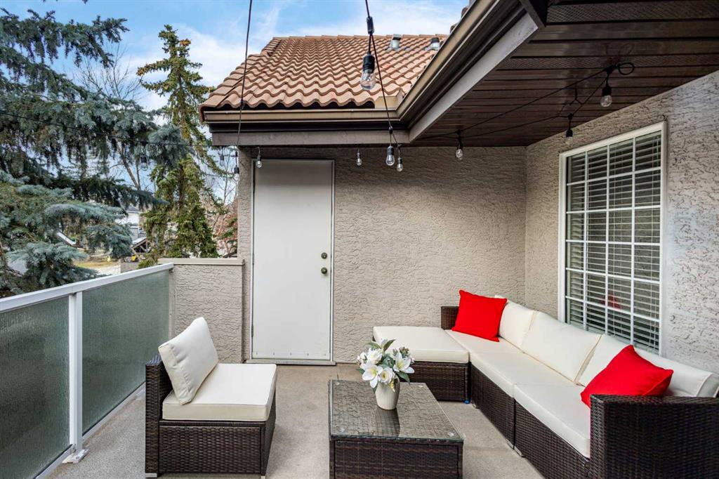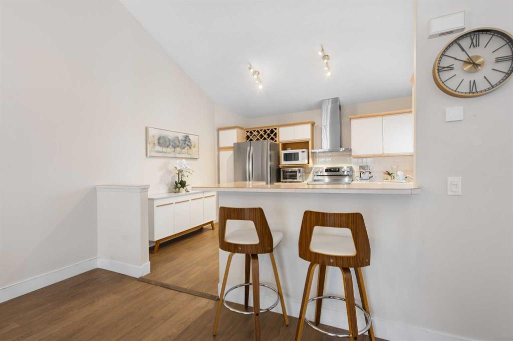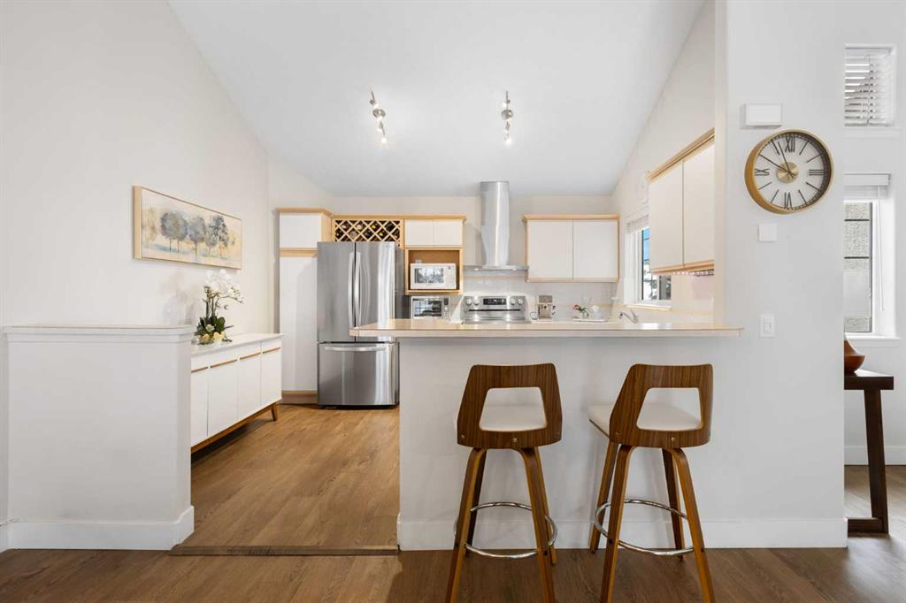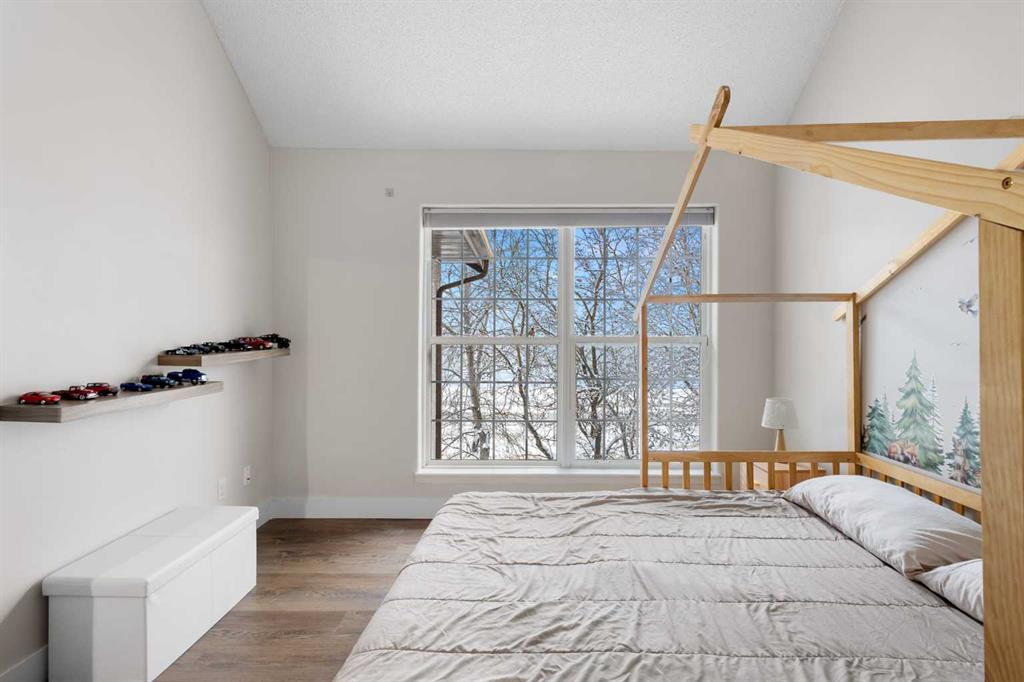 Wake up in Cactus Ridge and the first thing you notice is the light. Vaulted ceilings and oversized windows pull sun straight through the main floor — the kind of quiet, bright space that makes a Saturday morning coffee last twice as long. This upper-level stacked townhouse in Signal Hill overlooks Optimistic Park instead of a neighbour's window. That view is one of the reasons the current owners bought it. A wood-burning fireplace anchors the living room, and the whole space opens to a private balcony with a 25 sq ft storage room tucked off to the side. 1,221 sq ft, two bedrooms, two full bathrooms, and a floor plan that separates the primary from the second bed — the setup works for a dedicated home office, a guest room, or in-laws who stay a weekend. The primary has a 4-piece ensuite, walk-in closet, and a replaced bedroom window. The second bedroom sits across the plan with its own 3-piece bath. Underfloor heating runs through the entire home and into the attached garage. Warm floors from November through April, a low-dust, low-allergen environment, and a car you don't have to scrape at 7 a.m. in February. Recent updates from the sellers: full kitchen appliance package, washer and dryer, keypad front entry, security cameras at the door, balcony, and garage, a camera doorbell, new faucets and showerheads in both baths, LED stair lighting, digital thermostat, and new blinds on every window. Both bedroom windows have also been replaced. The home is pet-free and smoke-free — something allergy-sensitive buyers notice the moment they walk in. Outside the door: Sunterra Market, Starbucks, West Market Square, medical, dental, pharmacies, and the Bow River pathways are all inside a five-minute walk. Signal Hill and West Hills Shopping Centres are seven minutes by car. The complex has a private clubhouse residents actually use for gatherings, plus allocated parking directly beside the unit and ample visitor stalls. Move-in ready, with all furniture and décor available for separate purchase. Book a private showing or catch the open house.