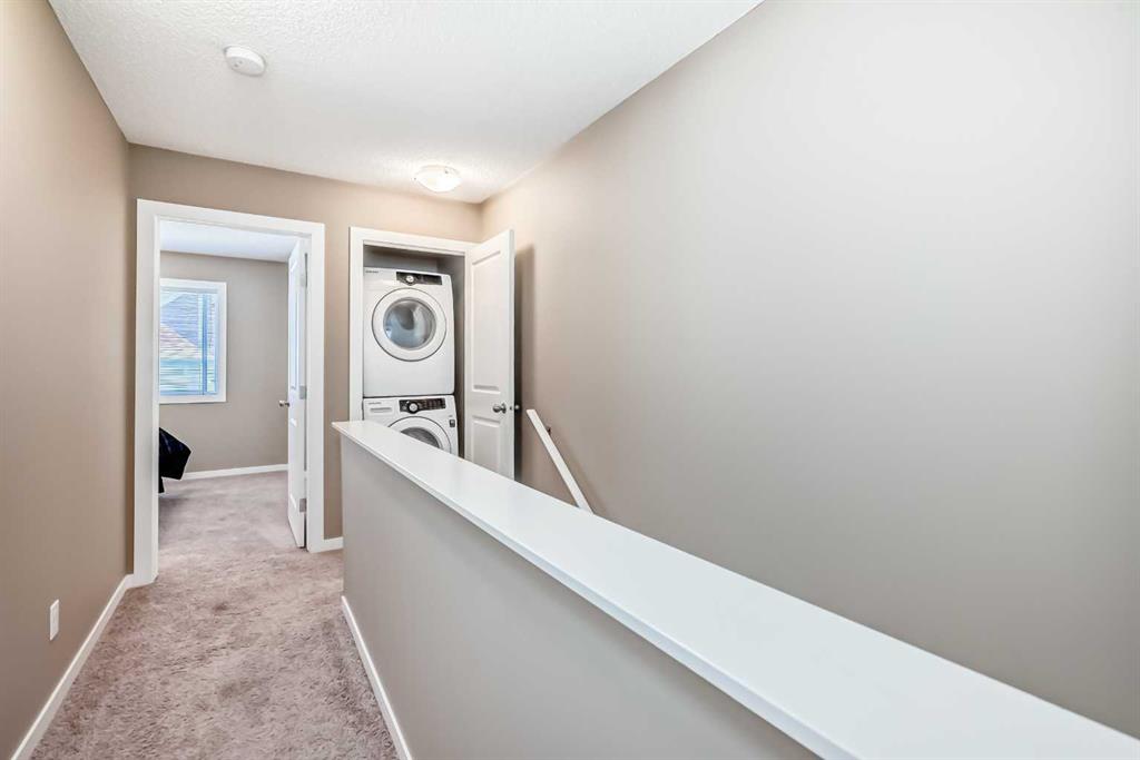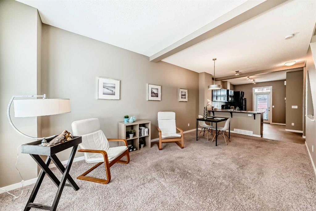 YOUR NEW HOME ... is located in one of Calgary's most sought after family friendly communities, this 2 storey townhome offers the perfect blend of style, comfort, and convenience. Steps from schools, playgrounds, daycare, and the New Brighton Athletic Park, future LRT, South Campus. You will also enjoy quick access to 130 ave shops, McKenzie Townes High Street and access to major routes like Stoney, Deerfoot trail and 52 st. Inside, oversized windows and tall ceilings fill the open concept layout with natural light. The kitchen features upgraded wood cabinetry, black appliances, a classic tile backsplash, and a large eating bar-ideal for both everyday living and entertaining. The main floor also includes a spacious dining area, inviting living room and convenient powder room. Upstairs, you'll find two large primary bedrooms, each with their own private ensuites and walk in closets - perfect for families, professionals or room mates. They are separated at each end of the hall, giving lots of privacy. Your laundry facilities are also on this floor, for the utmost of convenience. Additional highlights include a lower deck, an upper deck off of the kitchen with a gas hook up, a single attached garage and a second covered parking pad. The grounds are meticulously maintained and pride of ownership is exuded through the entire complex. Located in the middle of the complex and far away from 52st noise, the Low condo fees add to another reason to love living here!