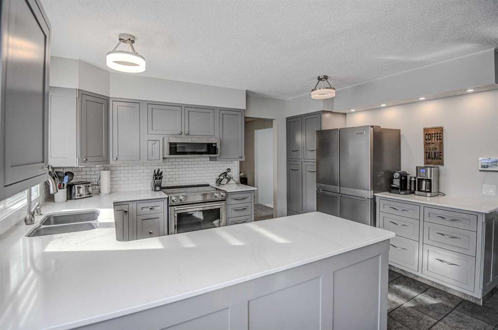 OPEN HOUSE Saturday February 21 and Sunday February 22 from 1 - 3 pm! Large 2 storey split in desirable, amenity rich, Canyon Meadows Estates. Loaded with upgrades and truly move in ready. All the major updates have already been completed, including new kitchen appliances (2025),new washer and dryer (2025), new ECO Star rated windows and gorgeous double front door (2025), plus a new furnace, central air conditioning, hot water tank, and garage furnace (2023). The main floor features a chef-inspired kitchen with stone countertops, ample cabinet space, a breakfast nook, a large formal dining room, and a spacious front living room. You’ll also enjoy the sunken family room with a wood burning fireplace, and patio doors leading to a large deck and sunny south facing backyard. This level also includes convenient bedroom currently being used as an office, main floor laundry and direct access to the oversized 22' x 28' heated garage with an 11’ ceiling. Upstairs, you’ll find a large primary suite with walk in closet and 4-piece ensuite, along with two additional generously sized bedrooms and another 4-piece bathroom. The fully developed basement offers even more living space, including a large family/rec room, a large bedroom, an office/den, a 3-piece bathroom, a storage area, and a large furnace room with built in shelving to keep everything neatly organized, There is even room to park your RV. This home is a must-see, beautifully updated, spacious, and priced to move. All that's left to do is move in!