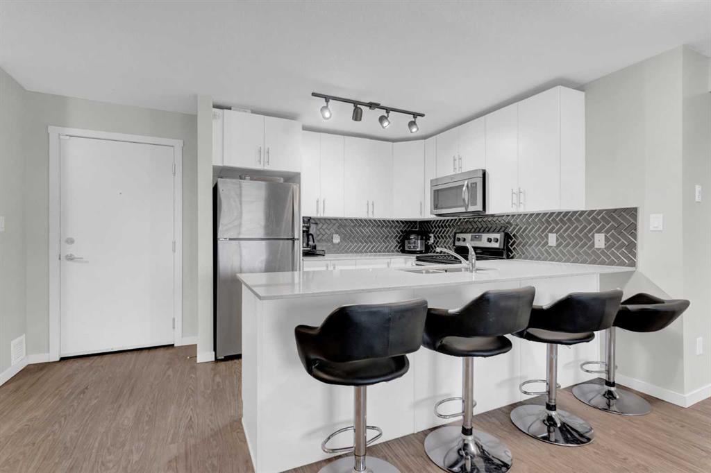 TOP FLOOR | CORNER UNIT | 2 BEDROOMS | TITLED UNDERGROUND PARKING! Welcome to this stunning top-floor corner unit in the highly desirable McCall Landing community of Skyview Ranch! Thoughtfully designed with a bright, open layout, this home blends modern style with exceptional functionality. The spacious living area is flooded with natural light from large windows and opens onto a private balcony perfect for relaxing or enjoying your morning coffee. A designated dining area comfortably fits a 6-piece dining set, offering a true home-style layout rarely found in condo living. The upgraded kitchen features quartz countertops, sleek tile backsplash, contemporary cabinetry, and stainless steel appliances, making it an ideal space for cooking and entertaining. Durable vinyl plank flooring runs throughout the main areas, while plush carpet in the living room and bedrooms adds warmth and comfort. Enjoy the convenience of in-suite laundry with side by side washer and dryer, generous storage, and a titled underground parking stall, ensuring comfort and security year-round. As a resident of McCall Landing, you’ll have access to an impressive array of amenities, including a fully equipped fitness centre, recreation/party room, bike storage, and a vibrant community centre with an outdoor picnic area and dog run, perfect for pet owners (pets allowed with board approval). This well-managed, pet-friendly complex offers unmatched value, comfort, and community. Experience modern living in Skyview Ranch and make this beautiful condo your next home!
