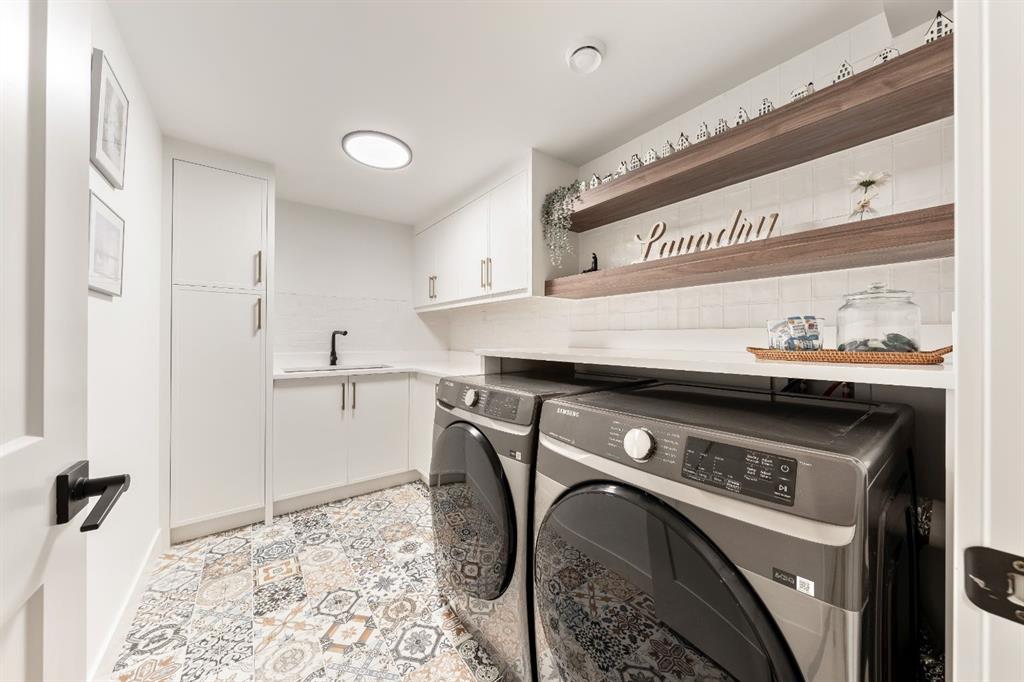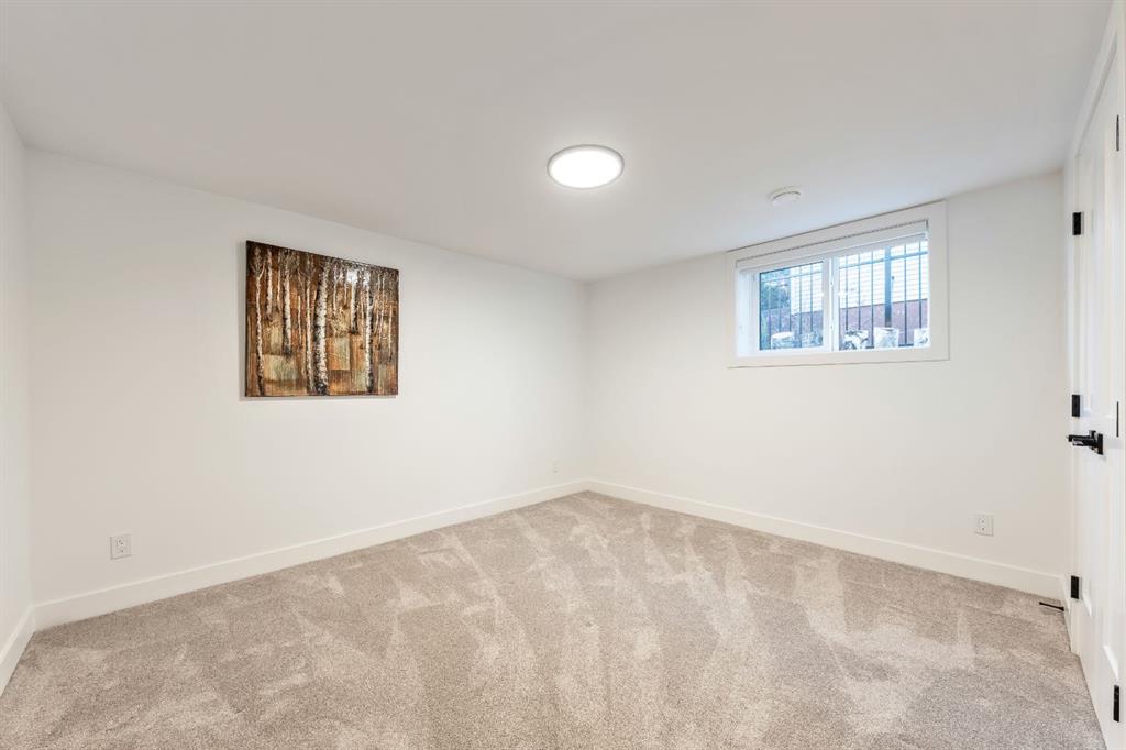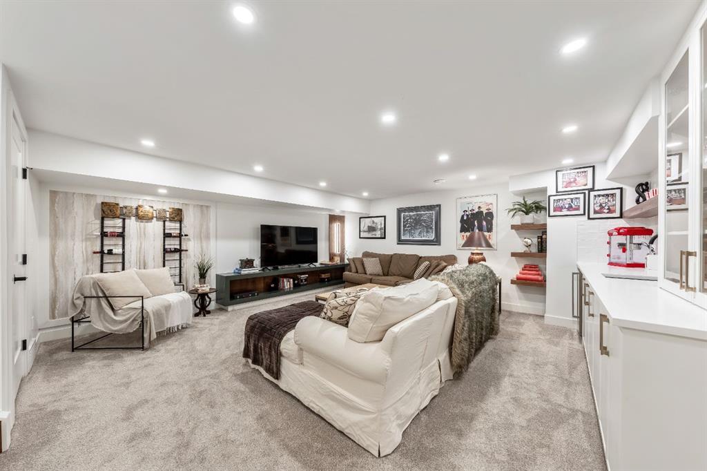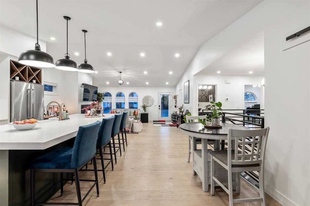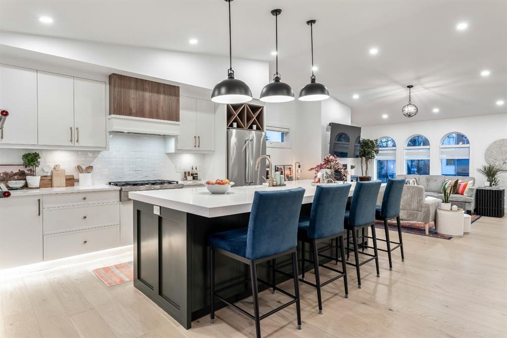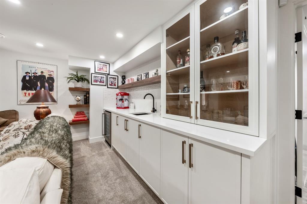 Welcome to this exceptional, fully renovated bungalow in the highly sought-after community of Wildwood—an outstanding opportunity for buyers looking for a truly move-in-ready home with timeless style and modern comfort. This property showcases a refined blend of contemporary finishes and classic architectural details, creating warmth and character rarely found in newer construction. Mature willow trees and professionally designed landscaping frame the approach, while new springline windows and premium Hardie board siding enhance the home’s striking exterior as you step through the charming brick archway onto the inviting front porch. Inside, the home has been thoughtfully reimagined with both front and rear additions, resulting in an expansive and functional layout. Vaulted ceilings, upgraded lighting, and beautiful white oak flooring highlight the bright, open-concept main level. Elegant arched windows flood the living space with natural light, drawing attention to the cozy gas fireplace that anchors the room. The kitchen is a true centrepiece, featuring a substantial quartz island, farmhouse sink, designer pendant lighting, custom hood fan, and a full KitchenAid stainless steel appliance package. Crisp white cabinetry and backsplash selections create a clean, sophisticated aesthetic ideal for both everyday living and entertaining. The adjoining dining area opens seamlessly to the rear deck through sliding glass doors, offering effortless indoor-outdoor flow. A sliding barn door reveals a beautifully designed mudroom complete with herringbone tile flooring, custom built-ins, a feature shiplap wall with bench and hooks, and floor-to-ceiling cabinetry surrounding the rough-in for a washer & dryer. Down the hall, the spacious primary suite offers a peaceful retreat with vaulted ceilings, a feature accent wall, and a custom walk-in closet with extensive built-ins. The spa-inspired ensuite includes dual sinks, a freestanding soaker tub, a rainfall shower with bench, heated floors, and floating vanities—luxurious details that elevate everyday living. The second primary bedroom also features its own walk-in closet and private ensuite, making it ideal for guests or multigenerational living, while the stylish powder room completes the main level. Fully developed basement offers a comfortable lounge atmosphere with plush carpeting, a recreation area with wet bar, two additional bedrooms with walk-in closets, a fourth bathroom, and an additional well-appointed laundry space. Extensive upgrades include new subfloors, trusses, furnace, air conditioning, plumbing, electrical, and more—providing peace of mind for years to come. A double detached garage is located off the rear alley, and utilities have been relocated underground for added functionality and curb appeal. Situated near parks, schools, and the many amenities along Bow Trail—with downtown Calgary just minutes away—this beautifully renovated bungalow offers the perfect balance of location, lifestyle, and luxury.