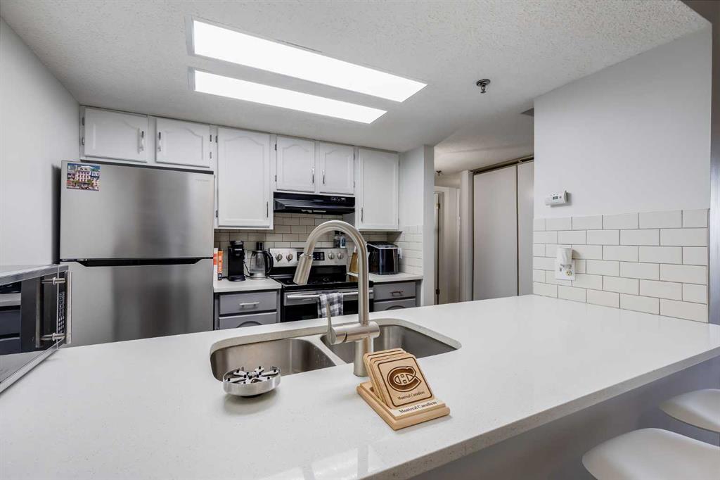 PUBLIC OPEN HOUSE SATURDAY FEBRUARY 21, 2026. FOR ACCESS PLEASE CALL 1 (289) 303-7753. Welcome to this beautiful, light, bright and spacious two-bedroom apartment on the 4th floor of Laureate Place. Located within a walking distance of the University of Calgary, Foothills Hospital, Children's Hospital, and C-Train, this prime location provides unparalleled convenience and ample services. From your private balcony you can enjoy spectacular views of Calgary’s downtown skyline, beautiful sunrises and sunsets. Enter this immaculate unit and you will find fresh paint and newer vinyl flooring throughout. This unit features two full size bedrooms, two 4-piece bathrooms with quartz counter tops, spacious kitchen with upgraded quartz countertop and a big central island, an open concept dining and living room. A generous size laundry room provides a good space for your storage needs, plus one heated underground parking is included. Refrigerator, washer and dryer 2022, paint and lights 2023. This apartment is the perfect choice for students, professionals, investors, and those seeking to be part of Calgary's finest community!