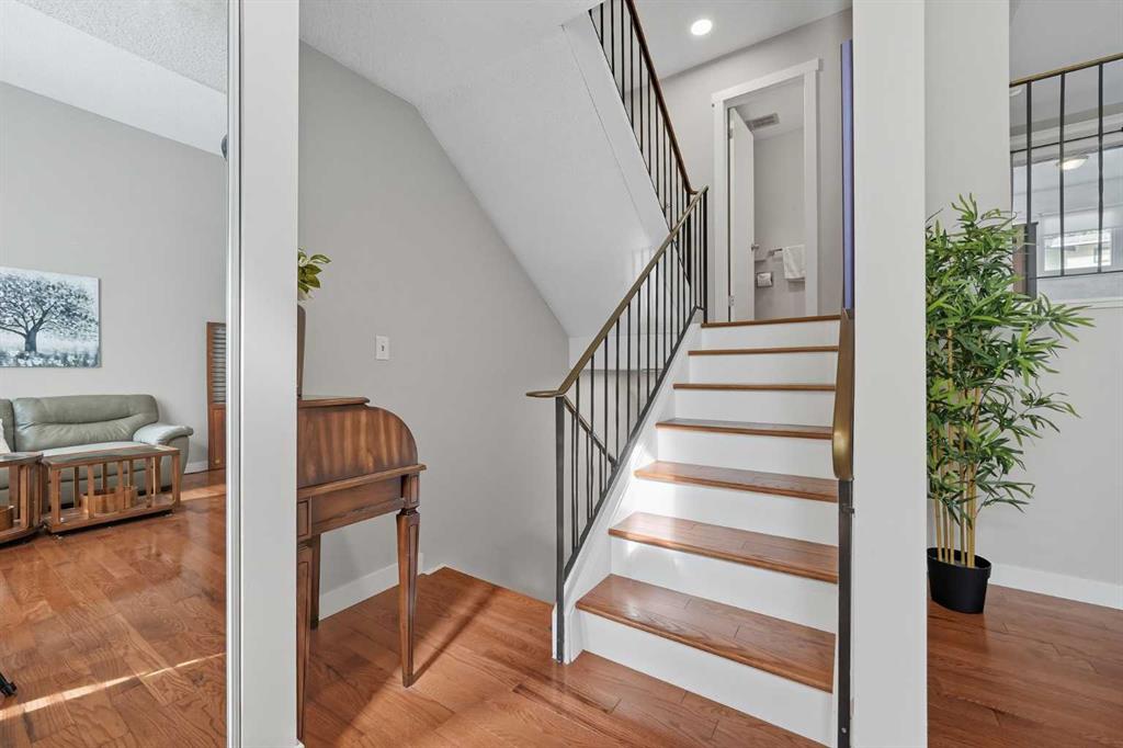 Rare Opportunity in Dalhousie! Welcome to this beautifully maintained 2 bedroom, 2 bathroom end-unit townhouse with an attached front garage in one of NW Calgary’s most desirable communities. Offering a spacious and functional layout, this home features gleaming hardwood floors, a renovated kitchen with quartz countertops, high-end stainless steel appliances, and clever built-in booth seating with extra storage. Enjoy hosting in the bright, open living and dining area with soaring ceilings, a wood-burning fireplace, and access to a covered balcony – perfect for morning coffee or evening relaxation. The private backyard provides additional outdoor living space, rare for townhome living. The king-sized primary bedroom includes ample closet space, while the oversized attached garage adds comfort and convenience. This pet-friendly complex is known for its exceptional amenity centre, featuring an indoor pool, sauna, squash court, gym, games room, and party lounge – all included with very reasonable condo fees. Located close to schools, parks, shopping, transit, and more. Don’t miss your chance to own this unique home in a vibrant and well-managed community!