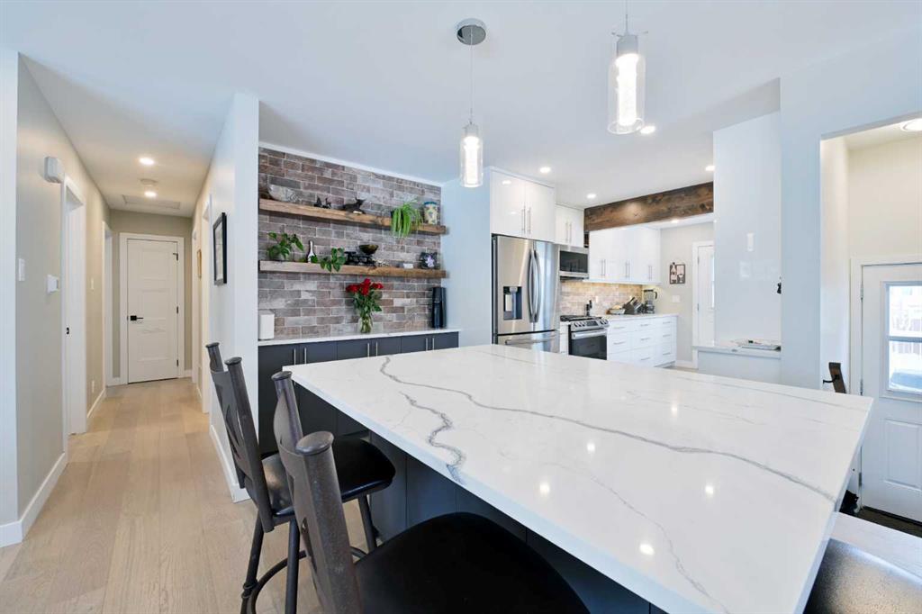 ** Open House Saturday February 21st from 11:30am - 1pm! ** This beautifully renovated custom built over 1,400sq ft bungalow on a quiet street and within easy walking distance to the Earl Grey Golf course, Lakeview Plaza, and numerous highly regarded schools is truly exceptional. Upscale finishes elevate every aspect of the home both inside and outside. The welcoming front entry opens to a spacious living room centered by the gas stone fireplace with custom designed wooden mantle. A large separate dining area makes it ideal for entertaining. The fabulous custom kitchen is designed for both function and style, with quartz counters, custom cabinetry, high end appliances and an abundance of storage. The huge primary bedroom with walk-in closet and spa inspired ensuite with heated floors overlooks the West facing backyard. Two additional bedrooms allow for the option of a separate office or den. The well designed completely renovated lower level offers a recreation room complete with wet bar, and two additional good sized bedrooms, an additional full bathroom, and laundry. The exterior of the home also features premium upgrades by the current owners, including mahogany exterior trim, real stone on the foundation, a triple-lock Pella security front door, and a heated double garage complete with epoxy flooring and its own electrical panel. The Outdoor living is exceptional, highlighted by an extensive cedar deck, reinforced concrete pad for the hot tub, gazebo, extensive landscaping, and 2 custom sheds. The widened driveway with new curbing adds both convenience and additional parking. This prime location, walkable to the Earl Grey Golf Course, schools, the Lakeview community centre, Glenmore Reservoir, the Canoe Club, and just a short drive away from Mount Royal University, The Tennis Academy, Rockyview Hospital, Chinook Mall, Heritage Park, and downtown — truly provides the perfect blend of lifestyle and convenience. Complete renovations completed in 2020/2021 with more recent additional investments to further enhance the home’s value and comfort, including new blinds and window coverings, epoxy garage flooring, interior and exterior painting, air conditioning, new gas line and gas stove, extensive electrical upgrades, stone foundation detailing, professional tree removal, and comprehensive landscaping.