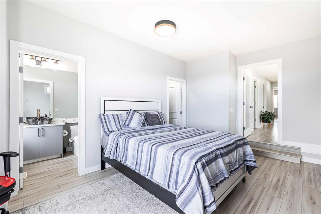 Welcome to this meticulously maintained and fully upgraded residence, offering over 3,200 sq. ft. of developed living space on a prime corner lot. This home has been thoughtfully reimagined to perfectly accommodate multi-generational living, extended families, and large gatherings. Main Level: A Chef’s Dream - The heart of the home features beautiful hardwood floors and a living space flooded with natural light. The primary kitchen is a masterpiece with quartz countertops, upgraded lighting fixtures, a massive center island that comfortably seats 4, a wine fridge, and extended cabinetry. For the serious cook or those hosting large events, the current owners have added: A Spice Kitchen - Discreetly located off the main kitchen, complete with a gas range, sink and dedicated fridge. Secondary Garage Kitchen - A clever addition in the garage corner, designed specifically to manage heavy-duty cooking for large family celebrations. Entertaining Space - A spacious family room with a gas fireplace and a full integrated sound system. Upper Level: Dual Primary Suites - The upper floor has been expertly reconfigured to maximize comfort and privacy. The Original Primary Suite features a spa-like ensuite with granite countertops on a double vanity and a massive walk-in closet. A New 2nd Primary Suite: The former bonus room has been professionally converted into a second full primary suite, complete with its own private ensuite and walk-in closet. Two more generous bedrooms and a well-appointed main bath complete this thoughtfully designed level. Basement & Outdoor Living - The fully finished basement adds even more versatility with a massive living area (currently used as a bedroom) and an oversized bedroom, bringing the total to 6 bedrooms in the home. Stepping outside, the west-facing backyard is an entertainer’s paradise, featuring professionally completed concrete patio, fencing, and lush landscaping. The double attached garage is not just for parking; it’s equipped with a natural gas heater for year-round comfort. Location & Recent Maintenance: New roof and siding (2026); wood fence replaced (2021). Prime Location situated steps away from several schools, including the Skyview Ranch Elementary/Middle School. With dual primary suites comprising 6 bedrooms, and a triple-kitchen setup, this is a very rare find specifically tailored for the modern, extended family. Message me to arrange a showing if you are not already working with a REALTOR.