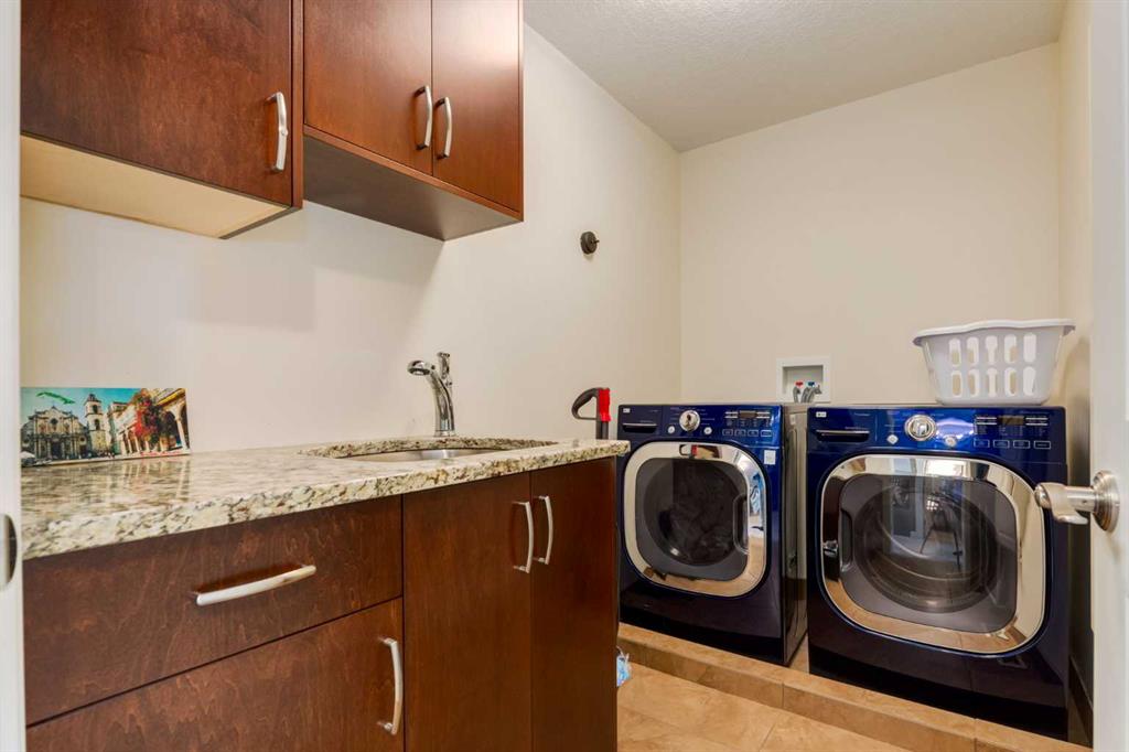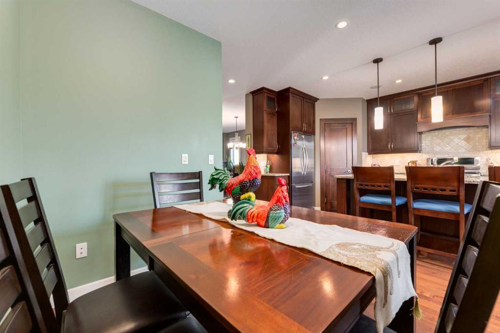 This stunning custom-built semi-detached home in the heart of Bowness offers exceptional style, comfort, and an unbeatable location. Charming curb appeal welcomes you with a front porch and durable Hardie Board siding. Rich maple hardwood floors flow throughout the open-concept main level, beginning with a cozy front family room featuring a gas fireplace and continuing into a spacious dining area and gourmet kitchen complete with full-height dark maple cabinetry, granite countertops, gas stove, built-in wine fridge, custom hood fan, travertine backsplash, and a large island with seating for three. A bright breakfast nook overlooks the private backyard with deck, privacy screen, and mature mountain ash tree, while a concrete walkway leads to the oversized double detached garage with additional storage. Upstairs, a skylight fills the space with natural light, complemented by elegant metal spindle railings. The primary suite offers vaulted ceilings, plush Berber carpet, and a spa-inspired ensuite with in-floor heat, dual sinks, granite counters, glass and tile shower with rain head, deep soaker tub, and a generous walk-in closet. Two additional bedrooms, a stylish main bathroom, and a convenient upper laundry room with sink complete this level. The fully finished lower level features 9-foot ceilings, in-floor heat, a large recreation area with corner bar and beverage fridge, a versatile flex room ideal for guests or a home gym, ample storage, and a two-piece powder room accented by a chandelier. Additional highlights include central vacuum, high-efficiency furnace, and sump pump. Enjoy a walkable lifestyle just steps to Main Street and Uptown Bowness with excellent local restaurants, cafés, and shops, minutes to Bow River pathways and Bowness Park—your year-round playground for summer picnics, river access, skating, and winter fun—with quick access to Winsport, downtown Calgary, and the Trans-Canada Highway for effortless mountain getaways.