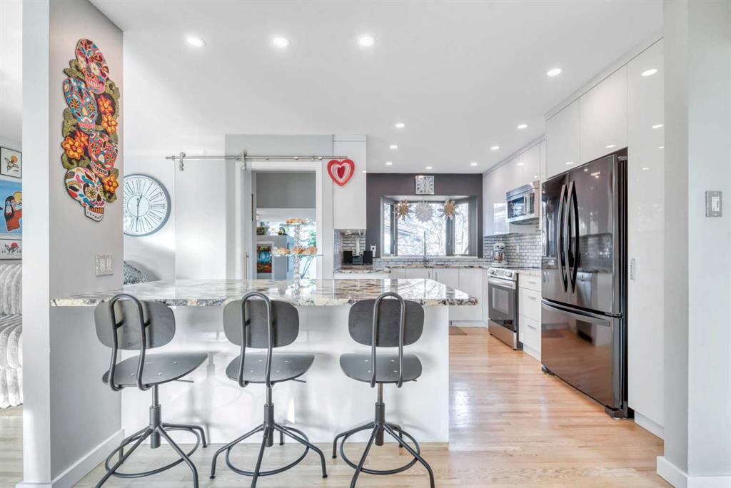 WOW! Take a look at this one-of-a-kind bungalow! This sprawling, mint-condition home is situated on a generous 52.5’ x 110’ lot, on a quiet cul-de-sac, in the sought-after community of Acadia, and has been impeccably renovated-from-top-to-bottom! Boasting over 2,550 square feet of fully developed living space with 5 bedrooms + den, 2 spa-inspired bathrooms, fully remodelled kitchen, bright living and dining room spaces, expansive sunroom (with floor-to-ceiling windows, skylights, vaulted ceiling, and heated floors), basement recreation room, and a ultra-rare double heated attached garage, this home is sure to impress! The home is thoughtfully oriented with a sunny south-facing front yard and a super-private north-facing backyard that is extensively landscaped with mature trees, gardens, a tranquil pond, patio area, and natural gas BBQ hookup—making it the ultimate outdoor retreat. Recent upgrades here include a high-efficiency furnace (2021), central air conditioner (2021), tankless water-on-demand system (2025), sump pump installation (2025), boiler system for the heated sunroom floors (2023), natural gas garage heater, newer asphalt shingles, newer skylight glass, oversized Lux vinyl windows (2025, in the main floor bedrooms and living room), two wood-burning fireplaces including a custom-built Rumford Fireplace (2023), premium Splendour Gold granite countertops (2021, kitchen/bathroom), all new appliances (kitchen/laundry, 2021-2025), main level hardwood floors (continuation and refinishing, 2022–2024), lower level luxury vinyl plank flooring (2023), and a central vacuum system. Pride of ownership is evident here! Homes seldom sell in this cul-de-sac! Don’t miss out - call now!