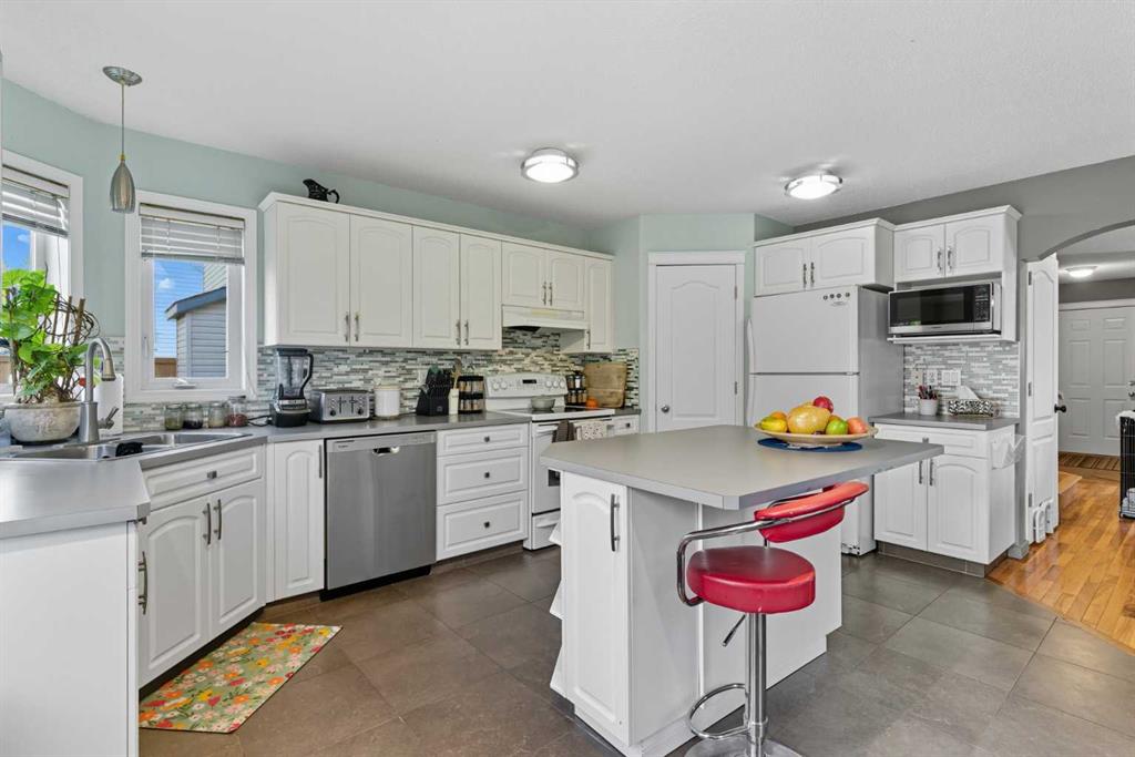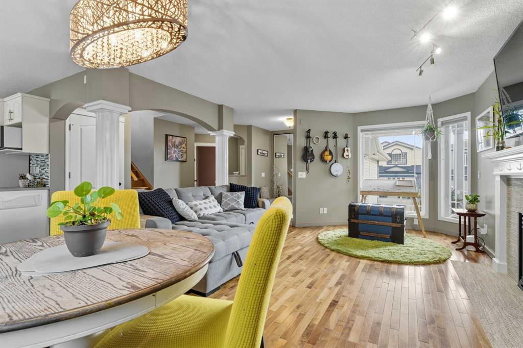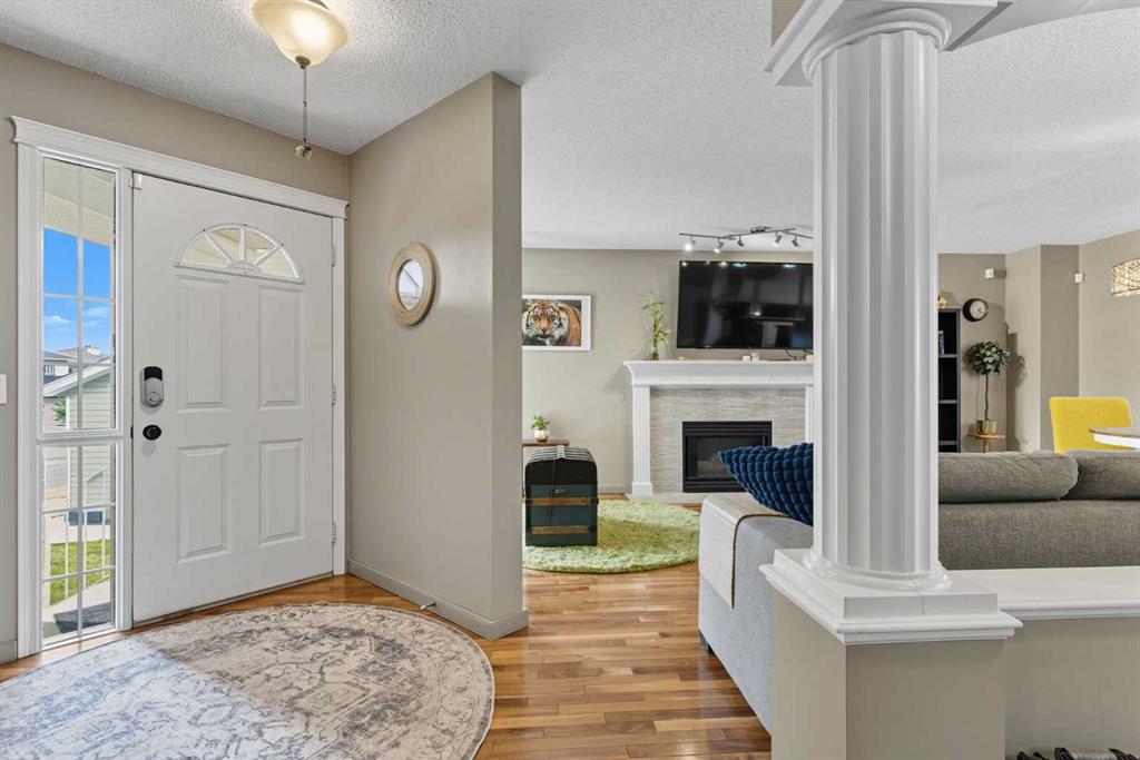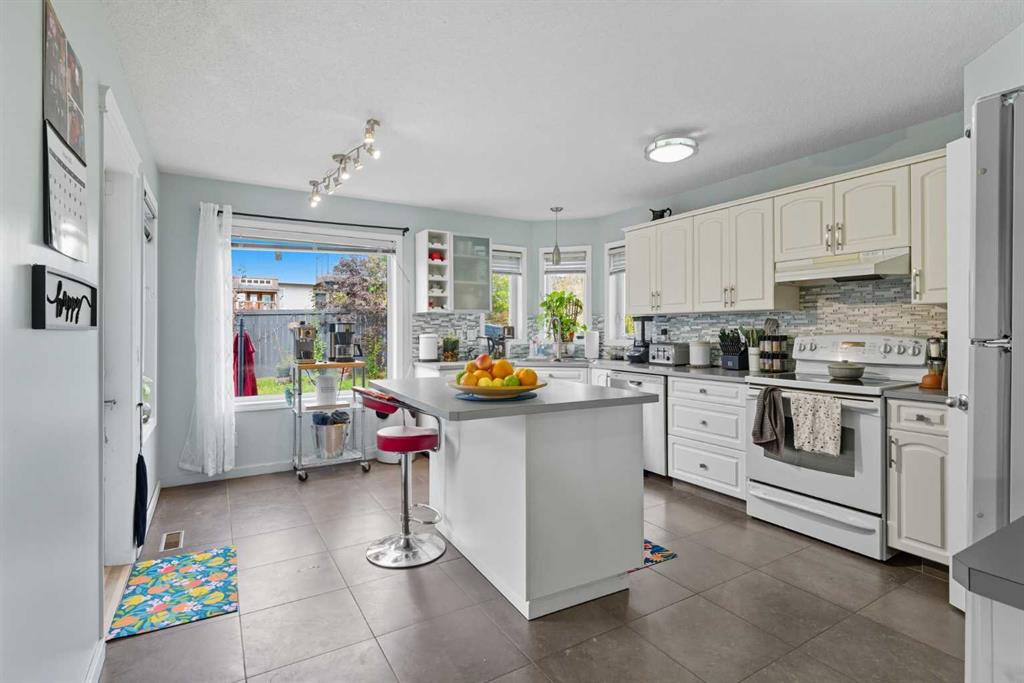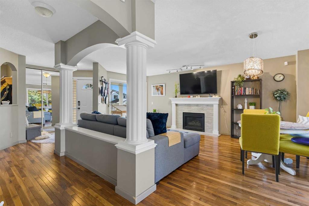 This beautifully maintained home in the desirable community of Tuscany offers a bright and open main floor that seamlessly blends the living, dining, and kitchen areas into a covered outdoor pergola space, perfect for entertaining or everyday living. Rich hardwood floors flow through the main living areas and are complemented by high-end trim, crown moulding, and stately columns, while an elevated stone tile gas fireplace adds warmth and character. The elegant white kitchen features a built-in wine and coffee bar, breakfast bar, corner pantry, a full appliance package including a new dishwasher, and stunning tile finishes with mosaic backsplash and oversized modern floor tiles, all enhanced by large windows that flood the space with natural light. Upstairs, the spacious primary suite offers a huge walk-in closet and a sleek ensuite finished with dark tile, glass shower enclosure with a rainfall showerhead, double sinks, ample cabinetry, and a built-in medicine shelf. Two additional bedrooms are generously sized, making them ideal for children, guests, or home office setups. The main floor also includes convenient laundry with a new washer and dryer. The fully developed basement expands your living space with another full living room, bedroom, a full bathroom, and multiple storage areas. Outside, the backyard is a true highlight—featuring an expansive deck with a BBQ gas line, established flower beds, and a covered pergola perfectly suited for outdoor dining or creating your own private oasis. A double attached garage adds plenty of storage and parking. Located just a few steps away from Tuscarora Place playground, scenic walking trails, and a dog park, and with quick access to schools, shopping, and major commuter routes, this home offers the perfect blend of comfort, elegance, and convenience.