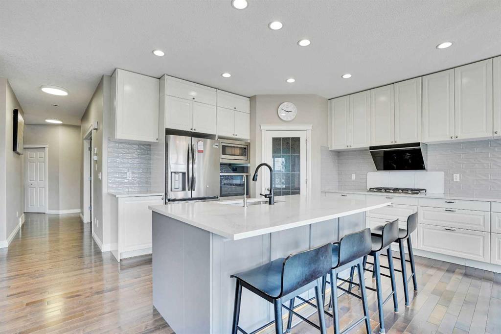Great cozy home backing into a greenspace/park,custom built home with tons of upgrade is sure to impress!!You will be amazed by this fully finished 2-storey walkout (3931sft total living space) home which offers 4 beds, 4 baths & some of the best views of NW Calgary. Upgrades inclde: New roof/siding/gutter in 2025,new kitchen cabinet in 2023,new dishwasher,new dryer/washer, new microwave/gas stove and hood fan,new carpets in upper floor,new water softer system. The main floor offers 9 ft. knock down ceiling, hardwood flooring throughout, an office, great room and dinning area that opens up into your own sunny urban paradise. The chef-inspired kitchen is equipped with stainless steel appliances, quartz kitchen countertop that’s all about functionality, while still providing space to set out drinks and appetizers at the eating bar for your friends and family. The extra-large windows allow in bright natural light during the daytime and enough room for everyone to nestled up by the fireplace at night. Upper floor features the uniquely designed stairs, sunny bonus room and three spacious bedrooms. The master bedroom has more than enough room to easily fit a king-sized bed, bedside tables and a dresser and still have enough room to do your morning stretches, also has a walk-in closet and 5-piece ensuite includes quartz countertop, shower, large soaker tub and dual sinks. Fully finished walkout basement features a huge recreation room, another bedroom and a full bathroom. Fully fenced and landscaped, this home backs onto a green space so you can safety watch your kids play at park. Only few minutes walk to school. Close to established amenities, transit, shopping and major roads, this home provides the perfect environment for your family to grow.This is a 10/10 house you must see on the market now! call your favorite realtor to have a showing now!!!