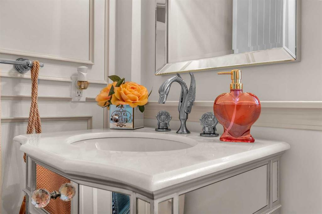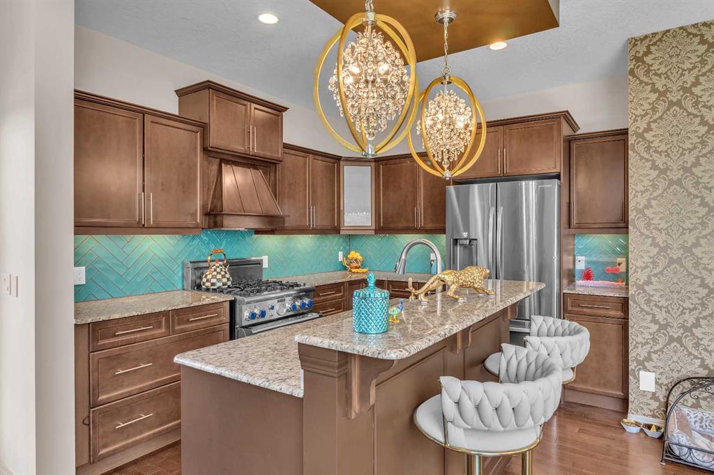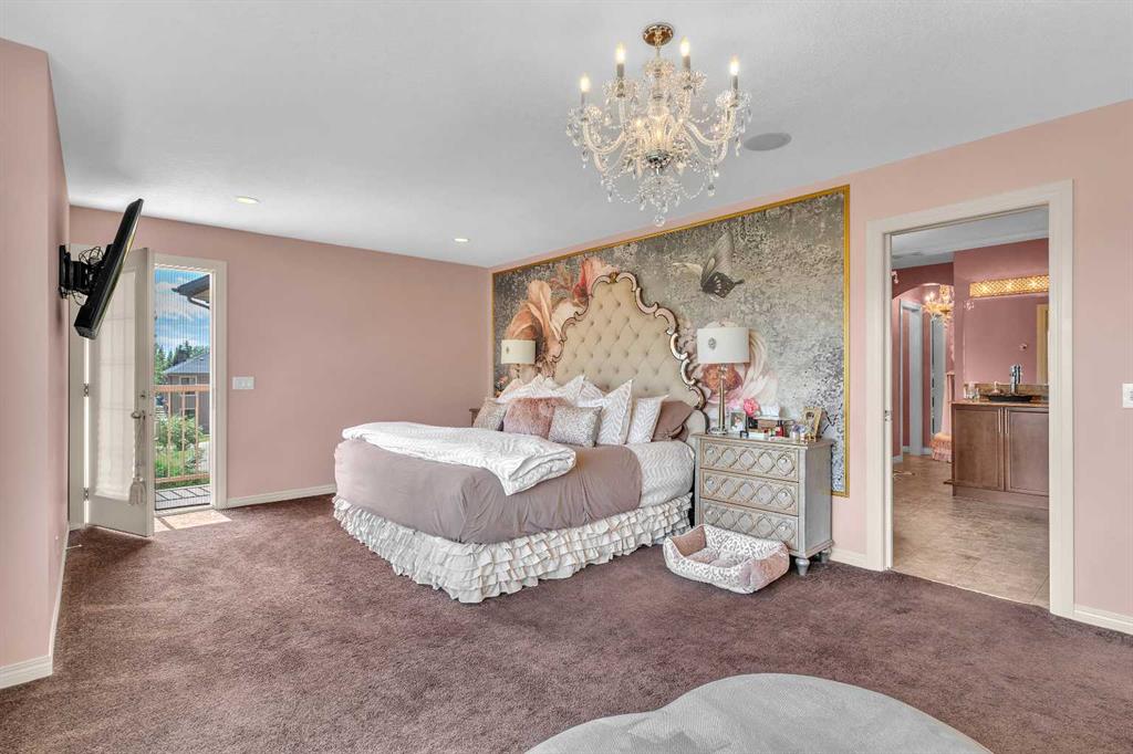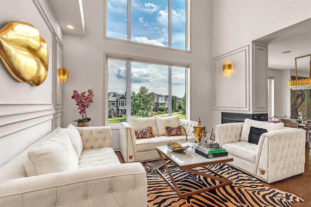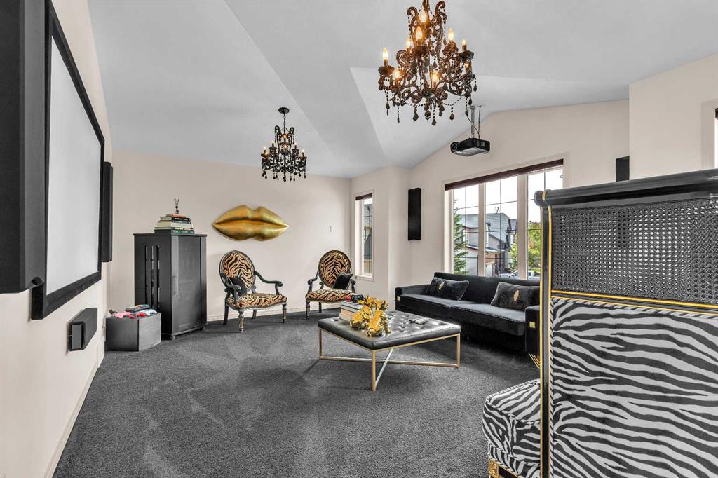 This STUNNING walkout onto Rainbow Falls pond is a must see! Featuring 5 bedrooms, theatre room, and panoramic water views, at 3850 sq.ft of space, this executive home blends size, style, and serenity in one of Chestermere’s most sought-after communities. Step inside to a bright and open main level with soaring ceilings, expansive windows framing the water, and a chef-inspired kitchen with granite counters, rich cabinetry, and a large centre island—perfect for family living and entertaining. The living room is anchored by a cozy fireplace, while the dining area opens to a deck overlooking the pond, creating an effortless indoor-outdoor flow. A second formal dining room, front office and sleek butler’s pantry round out the main floor. Upstairs, the spacious primary suite offers breathtaking views, a spa-like ensuite, and a generous walk-in closet, complemented by two additional bedrooms, full bath and incredible media bonus room. The walkout lower level is fully finished with spacious rec room with fireplace, wet bar, two additional bedrooms and full bathroom. Outside, the landscaped yard and covered patio invite year-round enjoyment of the peaceful waterfront setting. New items as of 2022 are Hot Water Tank, Thermadore Gas Stove, Microwave, Washer, Dryer, Bar Fridge, Dishwasher, basement fridge and microwave. With its refined updates, theatre and entertainment spaces, in-floor heated basement, and unbeatable location, this property delivers the lifestyle buyers dream about—whether it’s hosting friends, relaxing by the fire, or watching sunsets over the pond.