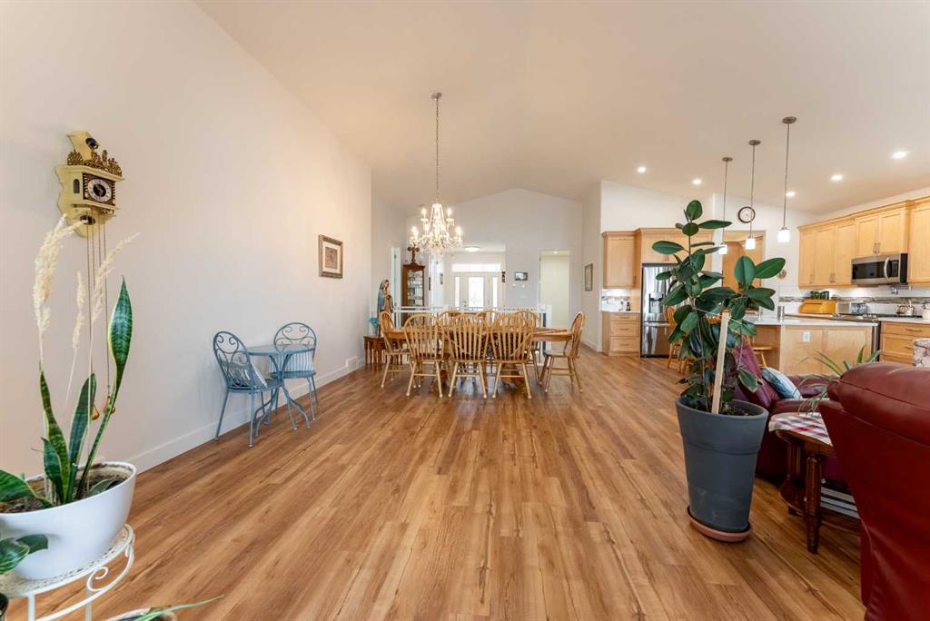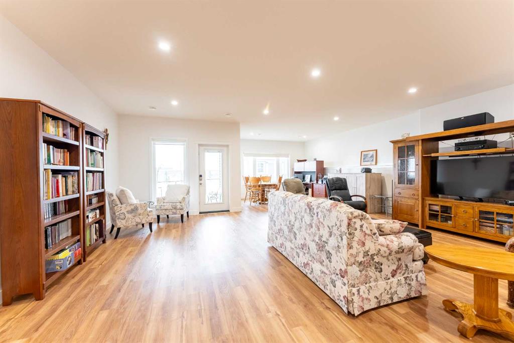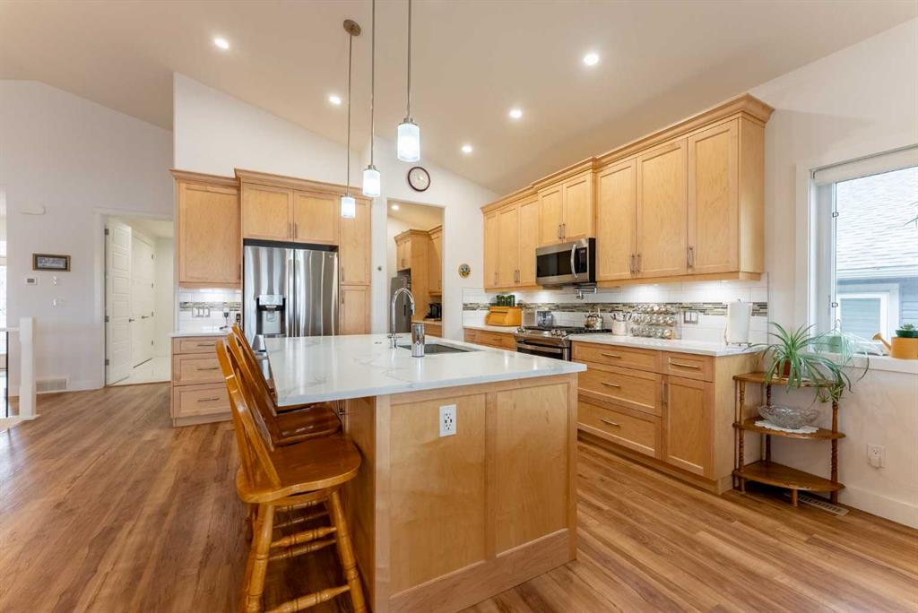 Custom built, impeccably maintained, and proudly offered by the original owner, this stunning executive walkout bungalow showcases thoughtful design, exceptional craftsmanship, and energy-efficient construction throughout. Step inside to a bright open-concept main floor featuring 9’ ceilings with a dramatic 14’ vaulted living area, durable vinyl flooring, and large triple-pane windows that flood the space with natural light. The beautifully designed kitchen features custom wood cabinetry, a reverse osmosis water system for that perfect fresh cup of coffee, a convenient pot filler at the stove, and upgraded under-cabinet lighting. A highly functional walk-through butler’s pantry with sink and upright freezer seamlessly connects to the large pantry, mudroom, laundry room, and heated garage. The main floor offers two bedrooms and two full bathrooms, including a spacious primary retreat overlooking the park with a large walk-in closet and an impressive ensuite. The fully developed walkout basement continues to impress with 9’ ceilings, in-floor heating, two oversized bedrooms with generous closets, a full bathroom, and a dedicated gym area with storage. Under-mount lighting along the stairs adds both style and safety while creating a warm ambiance as you head downstairs. Car enthusiasts and hobbyists will appreciate the 27’ x 19’ heated garage, complete with a polyurethane-coated floor, floor drain for year-round vehicle washing, a single tap with hot/cold mix water, and convenient man-door access. Built with durability and efficiency in mind, this home features engineered floor trusses, real plywood sheathing (not particle board), dual-zone heating, a water softener, and a boiler system replaced in 2023 that heats both domestic water and the basement floors. The exterior also includes fire-resistant wall board installed beneath the siding for additional protection. Outside, enjoy the walkout yard, natural gas BBQ hookup on the deck, permanent gemstone lighting, additional exterior pot lights, a custom shed with power run to it, and a mature apple tree producing incredible fruit. A rare opportunity to own a meticulously built, one-owner executive bungalow where quality craftsmanship and thoughtful design are evident in every detail.