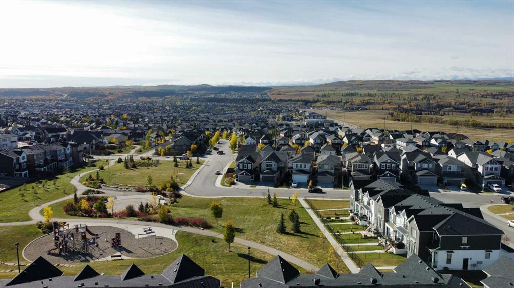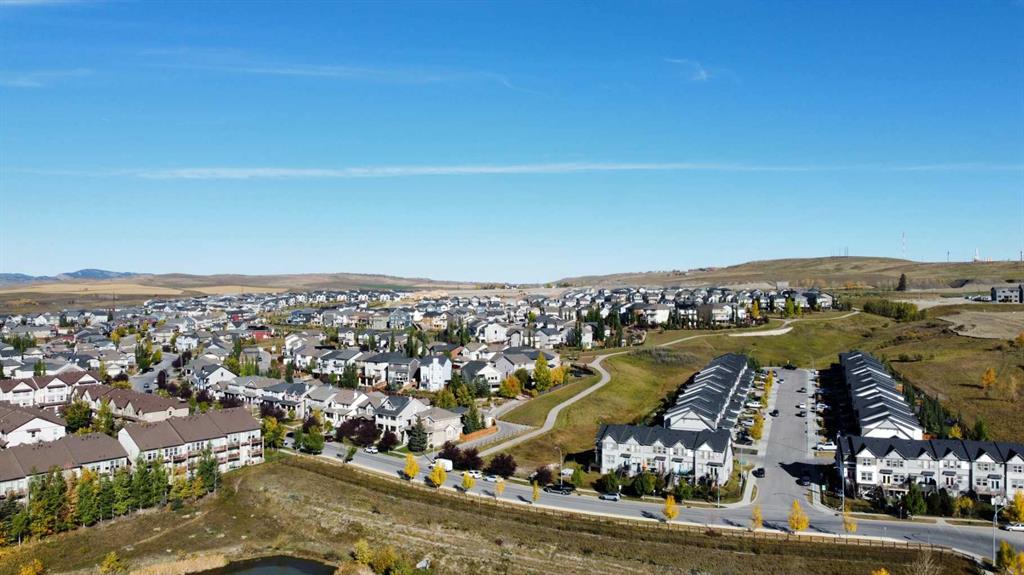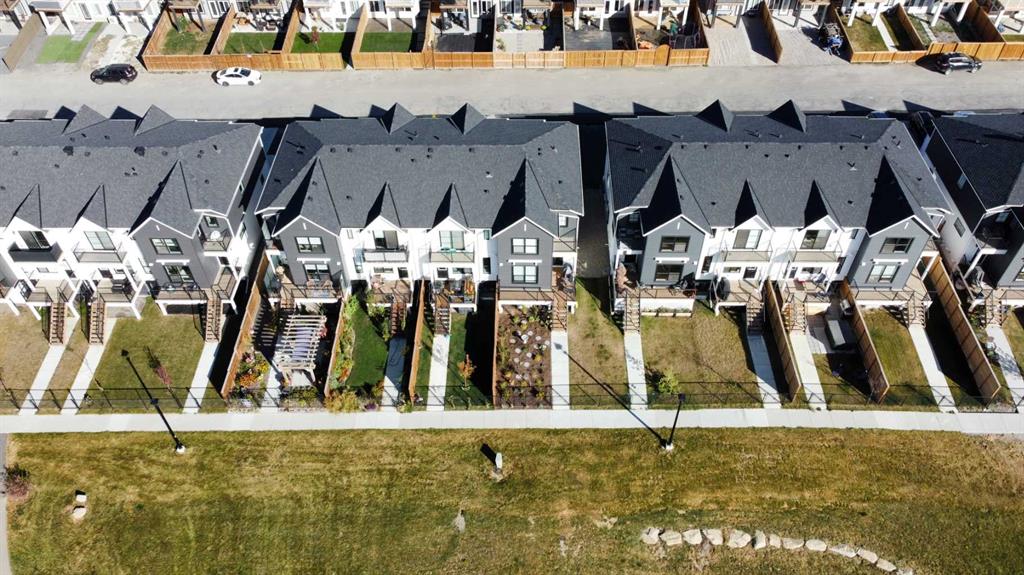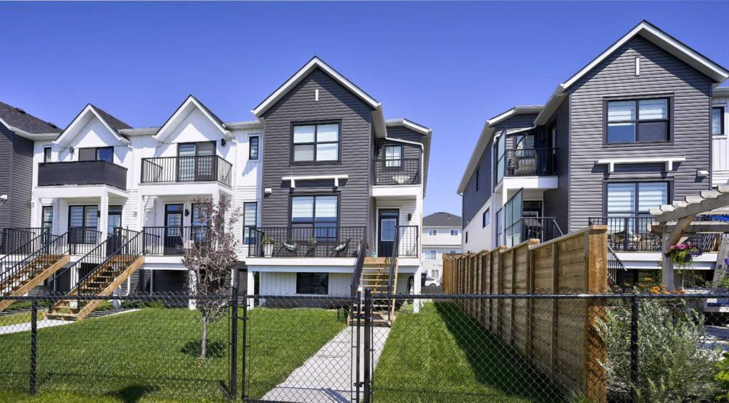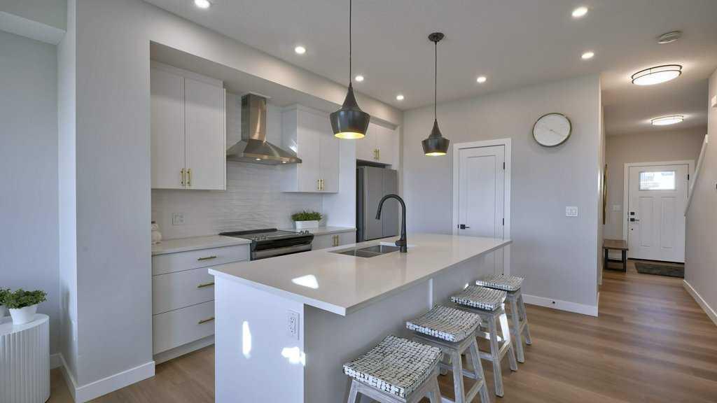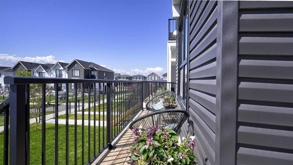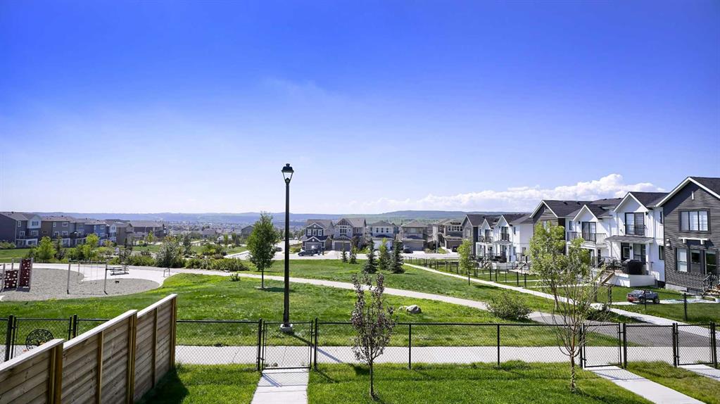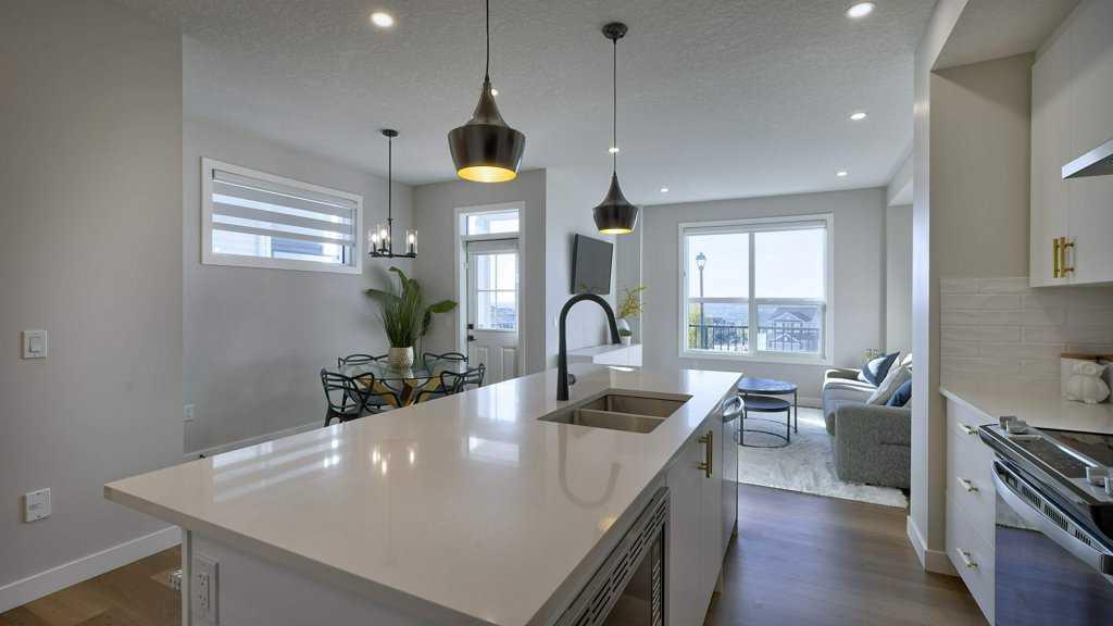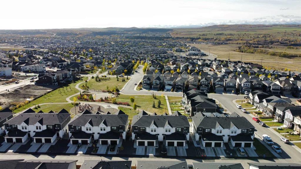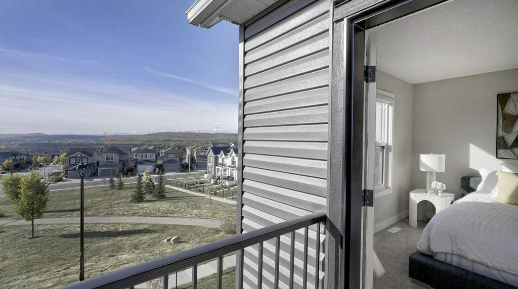 MOUNTAIN VIEWS | SOUTH-FACING BACKYARD | BACKING ONTO GREENSPACE | END UNIT | NO CONDO FEES. This stunning home combines a dream location with modern luxury—just like new! The bright, open-concept main level feels like a show home, featuring a large quartz island, full-length white cabinetry, sleek subway tile backsplash, gold hardware, modern lighting, stainless steel appliances, and a pantry. Knockdown 9-ft ceilings, pot lights, and luxury vinyl plank flooring add to the upscale feel. A convenient main floor half bath completes the space. Enjoy incredible views from every level with no neighbours behind. The sun-drenched living room offers direct access to the south-facing backyard, backing onto greenspace and pathways that weave throughout the community. Added luxury of motorized blinds on main floor and stairwell. Upstairs, the primary retreat is a true sanctuary with a walk-in closet, private balcony overlooking Cochrane and the mountains, and a spa-inspired 5-piece ensuite with dual quartz vanity, glass shower, and deep soaker tub. Two additional bedrooms share a full bathroom (also with quartz countertops), and the upper-level laundry closet adds everyday convenience. The home also features a separate side entrance leading to an undeveloped basement—perfect for storage or future customization. With NO CONDO FEES, mountain views, and a prime location backing onto a park and greenspace, this property offers the perfect blend of tranquility and modern design. OPEN HOUSE Sunday Oct 5th (noon-2 pm)