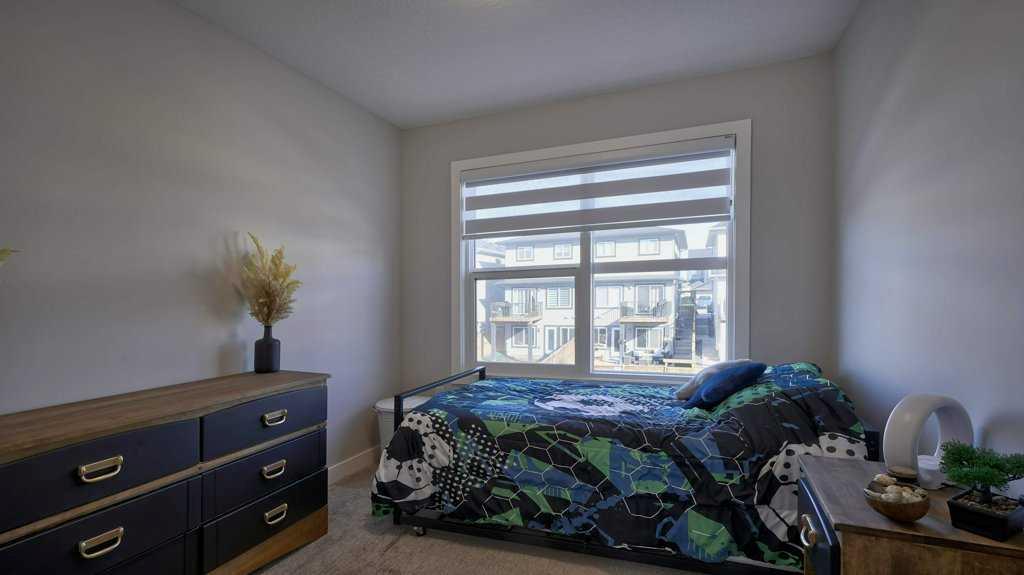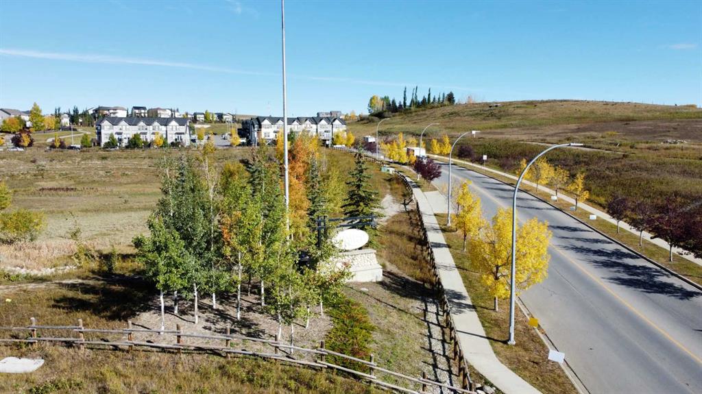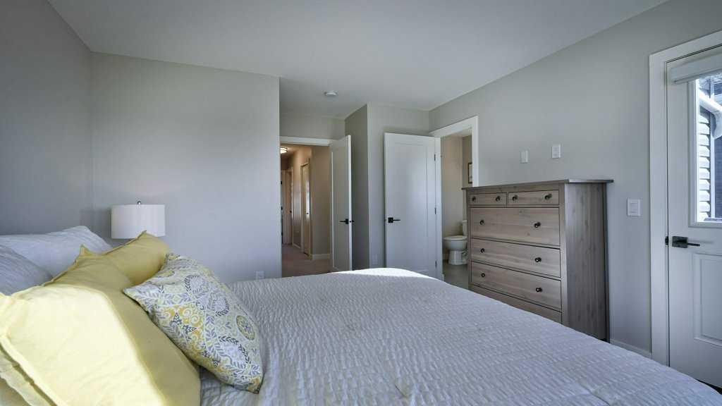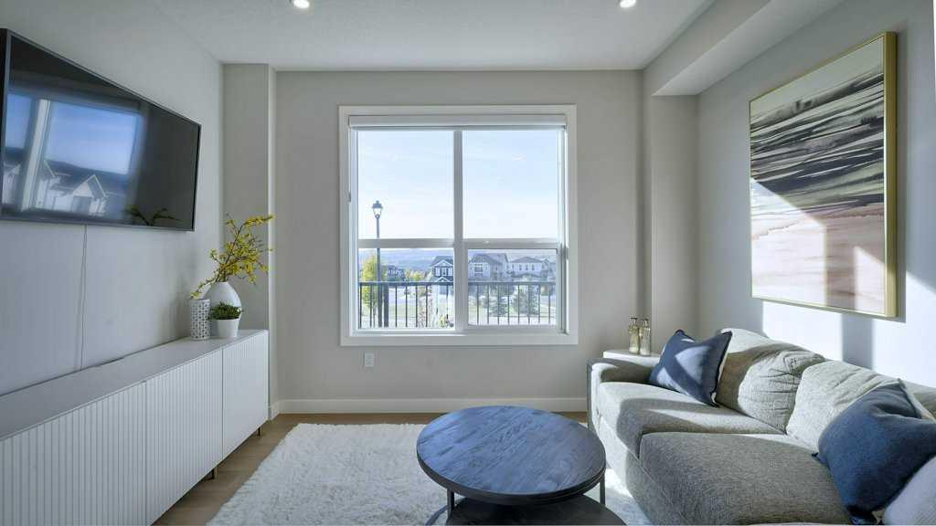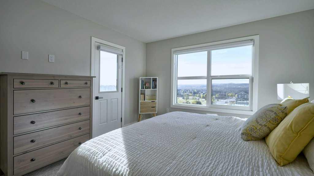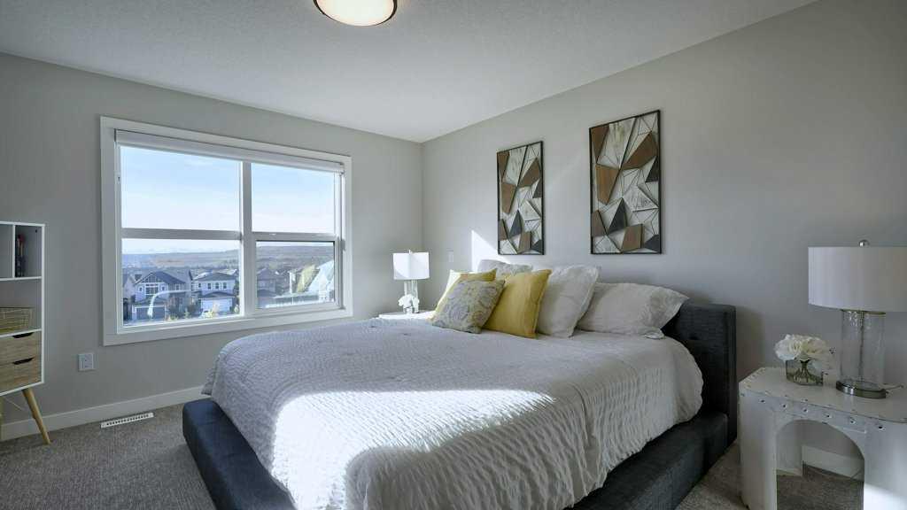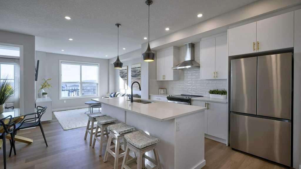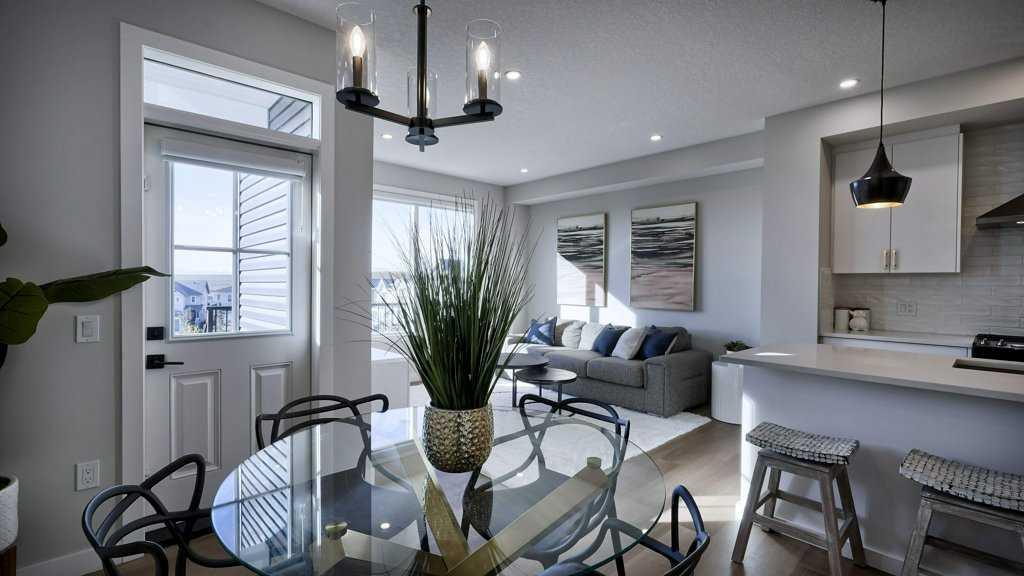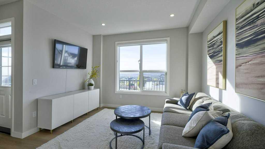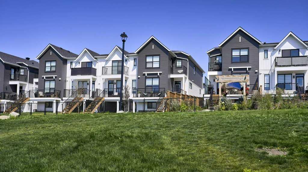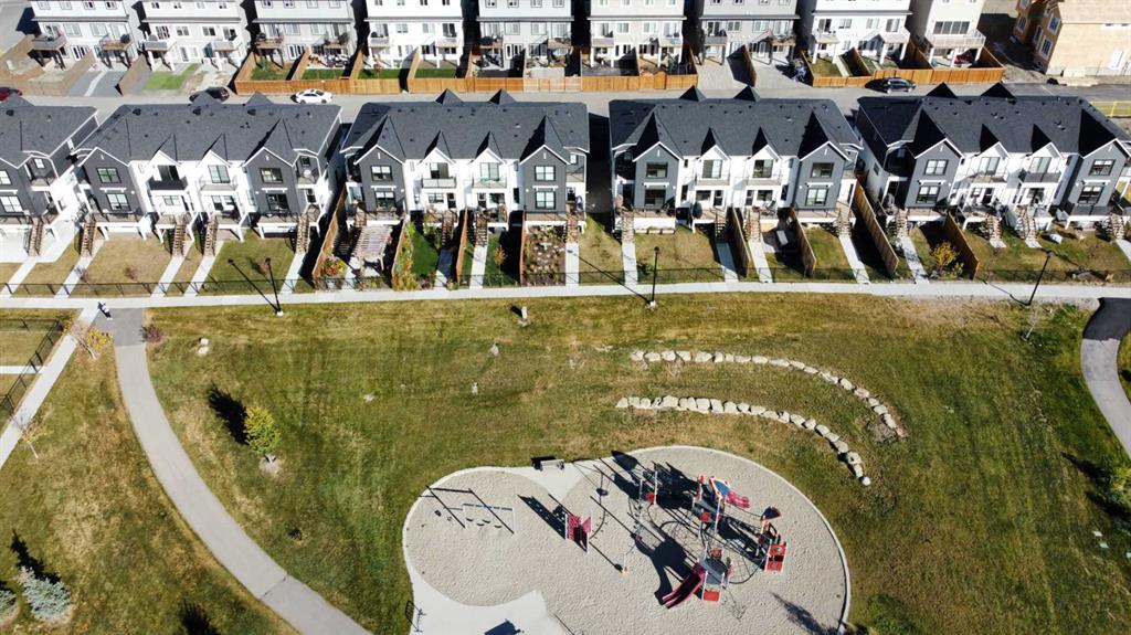 MOUNTAIN VIEWS | SOUTH-FACING BACKYARD | BACKING ONTO GREENSPACE | END UNIT | NO CONDO FEES. This stunning home combines a dream location with modern luxury—just like new! The bright, open-concept main level feels like a show home, featuring a large quartz island, full-length white cabinetry, sleek subway tile backsplash, gold hardware, modern lighting, stainless steel appliances, and a pantry. Knockdown 9-ft ceilings, pot lights, and luxury vinyl plank flooring add to the upscale feel. A convenient main floor half bath completes the space. Enjoy incredible views from every level with no neighbours behind. The sun-drenched living room offers direct access to the south-facing backyard, backing onto greenspace and pathways that weave throughout the community. Added luxury of motorized blinds on main floor and stairwell. Upstairs, the primary retreat is a true sanctuary with a walk-in closet, private balcony overlooking Cochrane and the mountains, and a spa-inspired 5-piece ensuite with dual quartz vanity, glass shower, and deep soaker tub. Two additional bedrooms share a full bathroom (also with quartz countertops), and the upper-level laundry closet adds everyday convenience. The home also features a separate side entrance leading to an undeveloped basement—perfect for storage or future customization. With NO CONDO FEES, mountain views, and a prime location backing onto a park and greenspace, this property offers the perfect blend of tranquility and modern design. OPEN HOUSE Sunday Oct 5th (noon-2 pm)