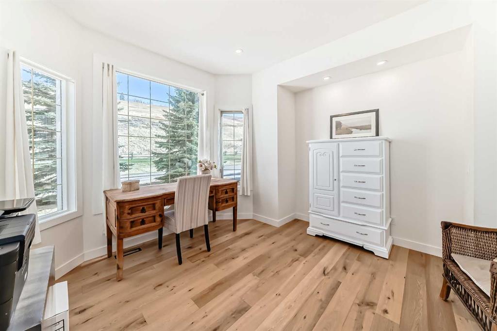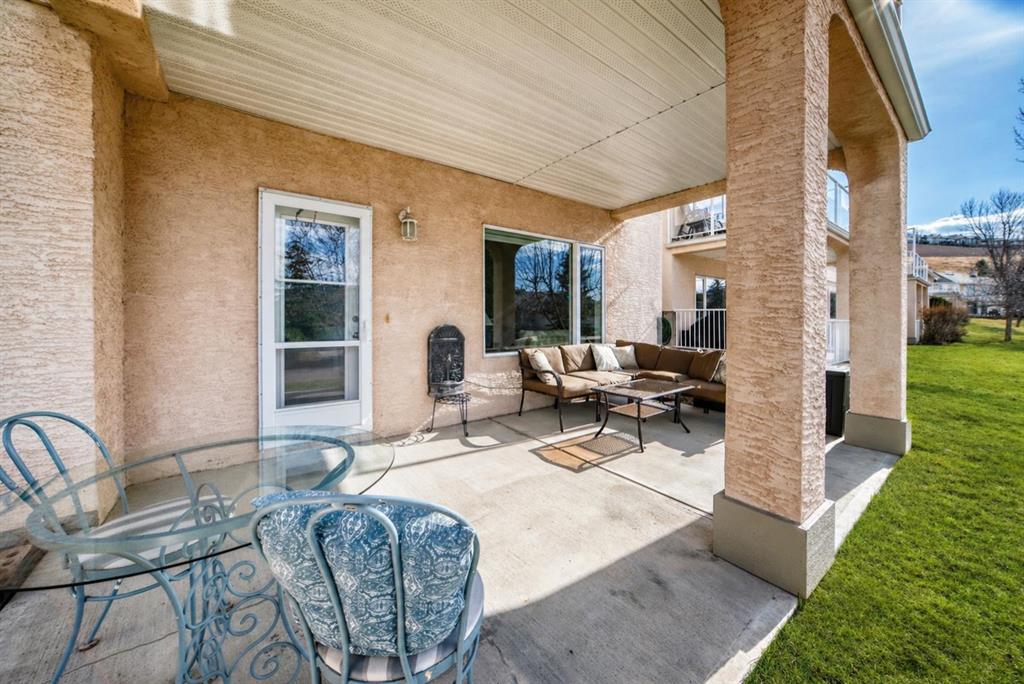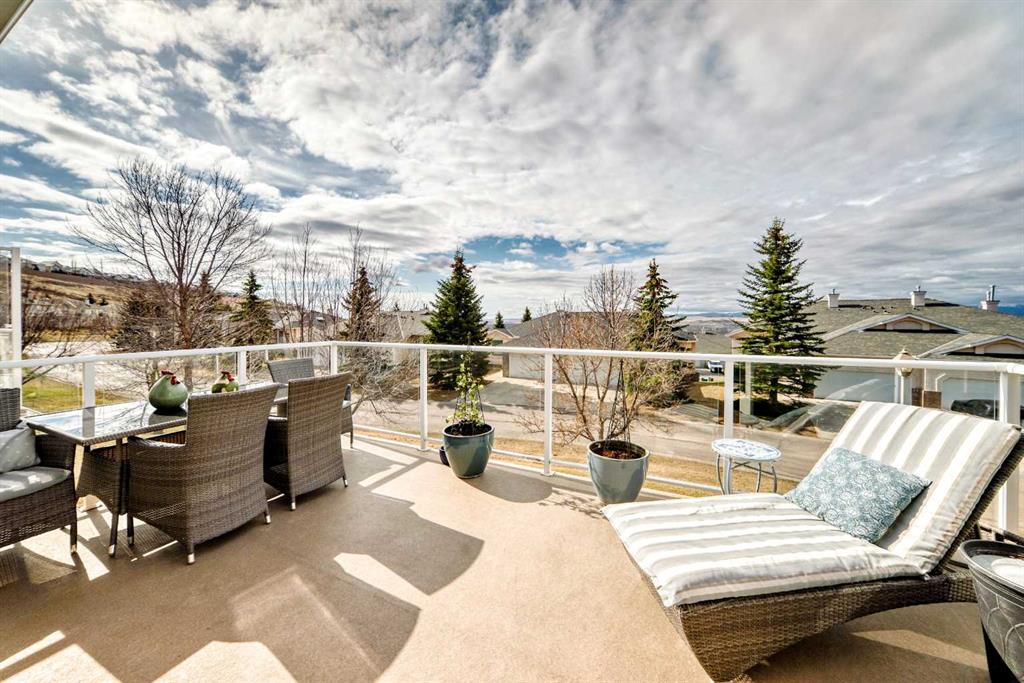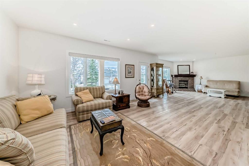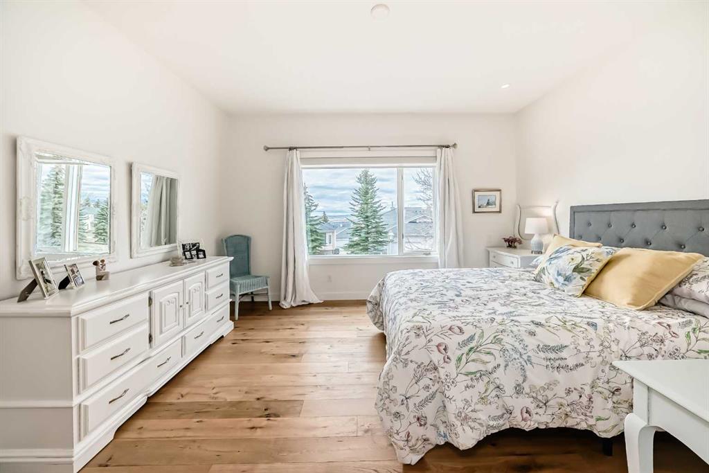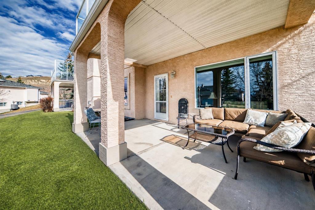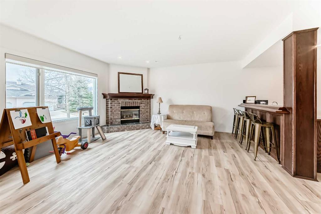 Welcome to this thoughtfully designed half duplex in the sought after community of Glen Eagles. Offering a perfect blend of comfort, style, and location. This spacious home features 3 bedrooms, 3 bathrooms, and a versatile den, with an open concept layout that seamlessly connects the kitchen, dining, and living areas. Soaring 9 foot ceilings and an abundance of windows fill the home with natural light while showcasing stunning mountain views. The main living area is warm and inviting with hardwood flooring and a cozy gas fireplace, creating the ideal space for both relaxing and entertaining. The primary bedroom is a true retreat, complete with a walk in closet and a luxurious 5 piece ensuite. The fully finished basement offers exceptional additional living space with in floor heating and a second fireplace. Completing the space is a wet bar, full 4 piece bathroom and two additional bedrooms, making it ideal for guests or extended family. Outside, enjoy a spacious backyard with lush grass and a concrete deck. The heated double garage adds year round convenience and comfort. Situated in a peaceful, scenic neighbourhood known for its quiet atmosphere and proximity to golf, pathways, and easy access to Calgary and the mountains.