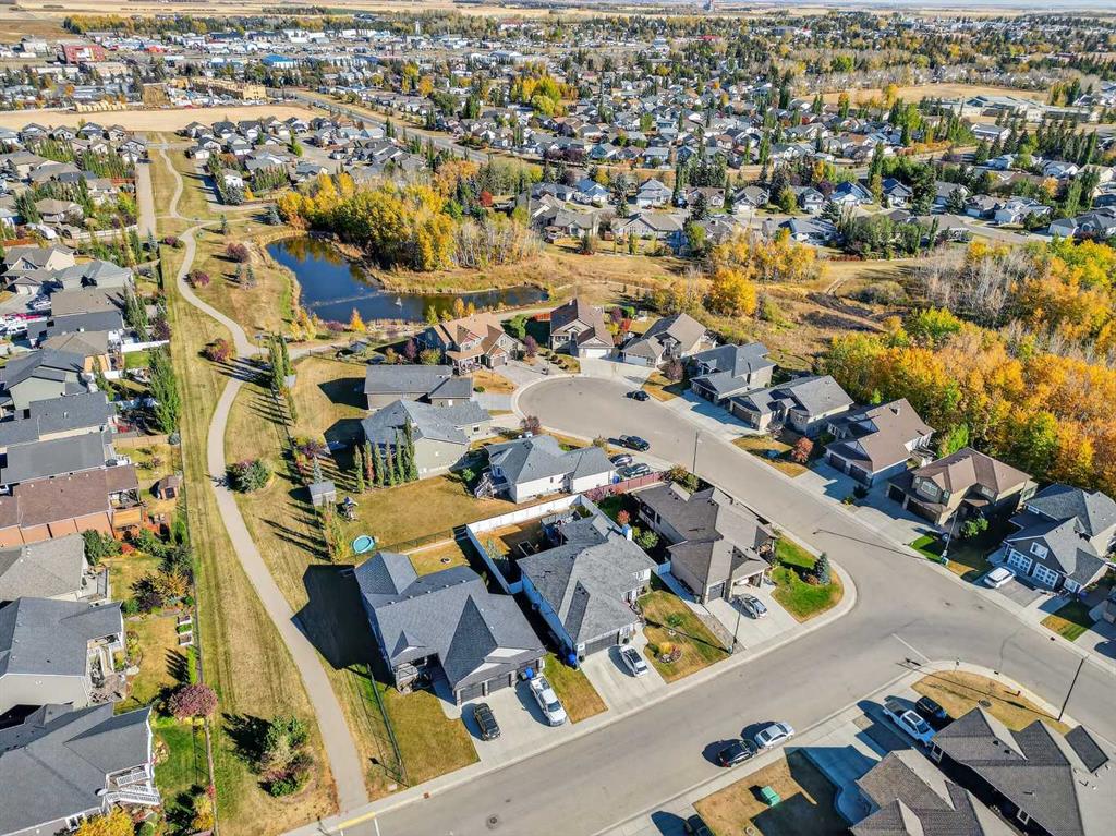 Welcome to 91 Briegel Road in the charming community of Olds, Alberta! This beautifully maintained 1,590 sq ft bungalow with a fully finished basement sits on a spacious 9,591 sq ft lot backing onto a scenic green space and pond, which transforms into a community skating area in winter. Inside, you’ll find 4 bedrooms (2 up, 2 down), 3 bathrooms, and high-end finishes throughout. The primary suite features a luxurious 5-piece ensuite with double sinks, a jetted soaker tub, and a walk-in closet. The spacious main floor laundry room is a dream—complete with cabinets and a laundry sink. The heart of the home includes a vaulted-ceiling living room with a cozy gas fireplace and custom built-ins, a kitchen with granite counters, skylight, walk-in pantry, and a large island—ideal for gatherings. The fully developed basement features 9-foot ceilings, in-floor heat, a massive rec room, 2 additional bedrooms, and a 4-piece bath. Enjoy entertaining outdoors with a two-tier deck (with lighting), gas BBQ hookup, stamped concrete patio, with a gas starter for a gas firepit, and enclosed under-deck storage. Other highlights include central A/C, a heated oversized garage, hardwood floors, and stucco siding. This home is the perfect blend of comfort, elegance, and outdoor living—backing nature with urban convenience just minutes away.