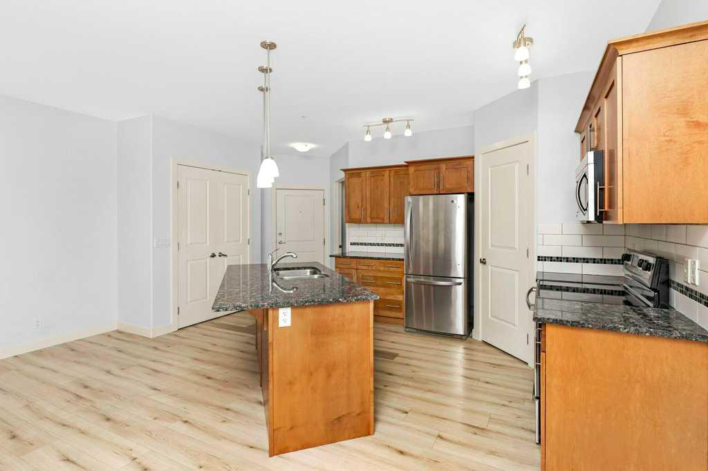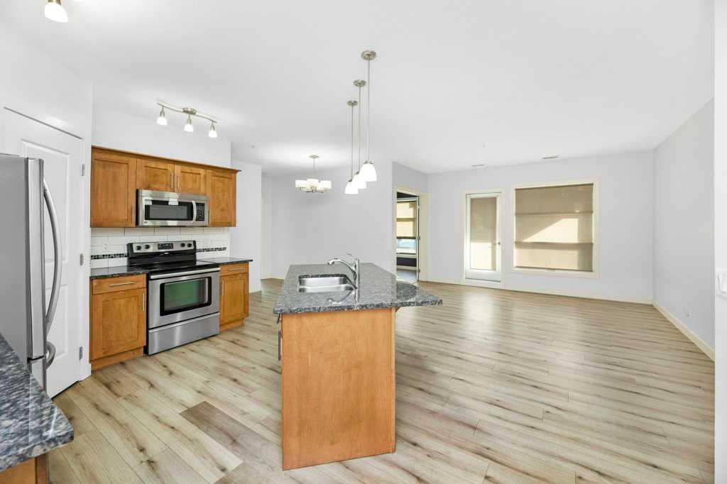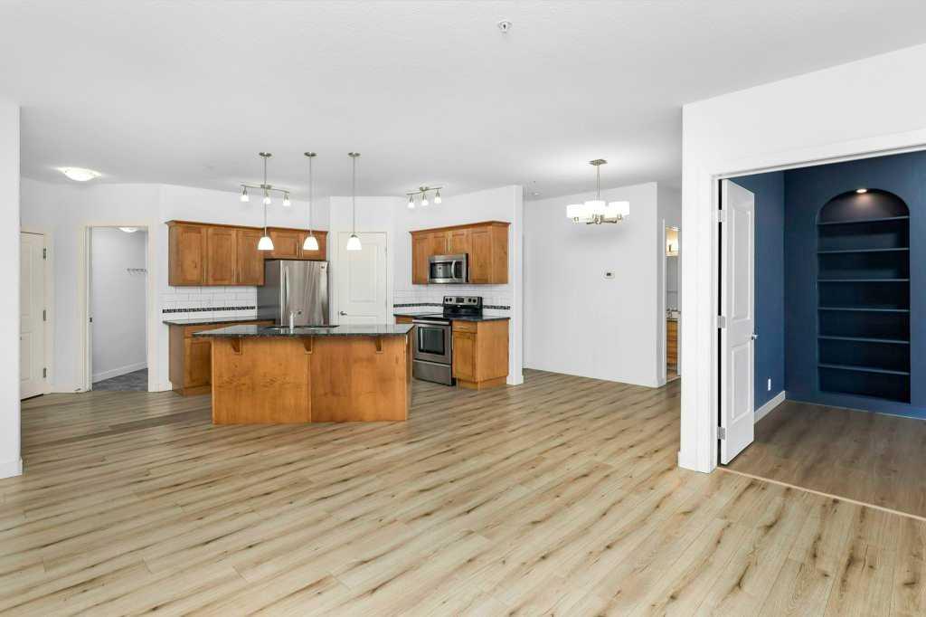 This bright and well maintained, main floor unit offers 2 bedrooms, 2 bathrooms, and a den with a built-in bookshelf is ideal for a home office or reading space. The open-concept kitchen features granite countertops and ample cabinet space, perfect for cooking and entertaining. The primary bedroom includes a walk-in closet and a 3-piece ensuite. A second bedroom and full bathroom provide plenty of space for guests or family. Enjoy added convenience with titled heated underground parking and a separate storage unit. Brava Condominiums offers exceptional amenities, including a fitness room, social room, games room, theater room, rooftop terrace, elevator, and secure entry. Whether you're a first-time buyer, downsizing, or looking for an investment, this unit combines location, lifestyle, and value.