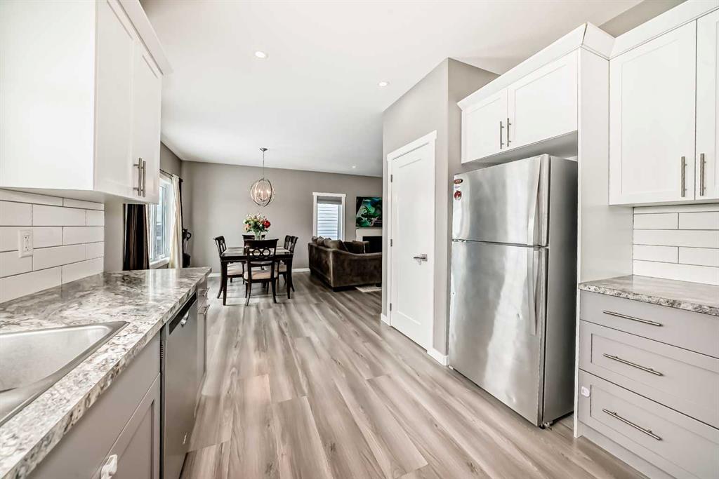Welcome to this beautifully maintained 2022-built home offering modern design, quality finishes, and exceptional value. Showcasing a bright open-concept layout, the main floor features a spacious living room with a coffered ceiling, textured detail, large windows, durable laminate plank flooring, and a stylish gas fireplace. The kitchen is both functional and elegant, complete with abundant cabinetry with crown moulding, a full tile backsplash, stainless steel appliances, and a full-size pantry. The adjoining dining area provides access to a sunny, south-facing deck and a large backyard—perfect for entertaining. The primary bedroom offers a private retreat with a four-piece ensuite and dual closets. Two additional front-facing bedrooms are well sized and filled with natural light. The fully fenced yard features a high-quality vinyl fence, and the lawn has been professionally landscaped and meticulously maintained. The unfinished basement boasts high ceilings and in-floor heating roughed in, offering excellent potential for future development. Additional features include a high-efficiency furnace and heat recovery ventilation system. Located in the desirable Laredo community, close to shopping and amenities, this home combines style, comfort, and future potential. Move-in ready and a must-see!