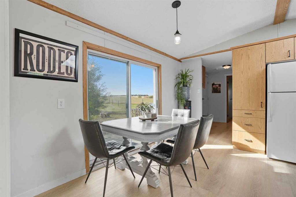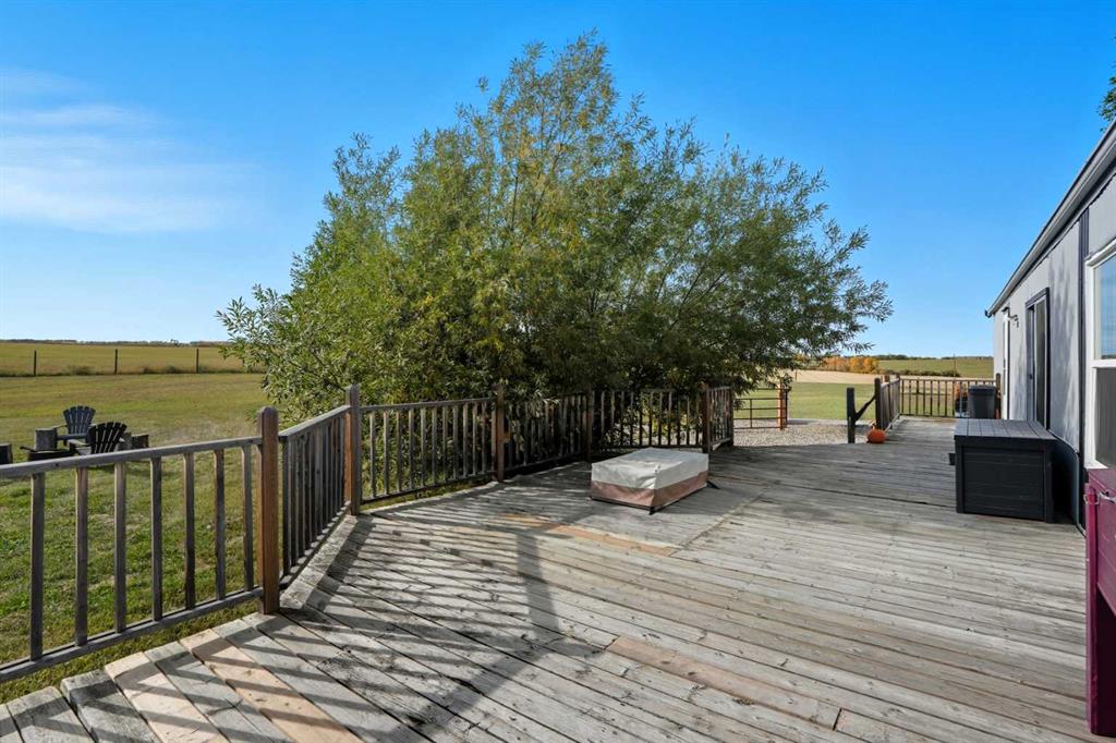 Your dream of peaceful, scenic countryside living is wonderfully attainable with this lovely home, situated on 2.5 acres just 40 minutes from Calgary's North end! Also 23 minutes to Carstairs and just 7 to Cremona. Enjoy the beautiful views and the great outdoors on your own vast property! Inside the thoughtfully updated home, the open main living space feels bright and airy, with vaulted ceiling, skylight, and every window has a beautiful view! The kitchen is open to the dining space, with patio doors leading out to the deck that runs nearly the full length of the home! The living room has a cozy wood stove (cleaned including chimney, painted, recent WETT inspection). The primary bedroom is conveniently located by the laundry space, and features a spacious full en suite! On the other side of the main living area, a 2nd full bath serves the 2 secondary bedrooms. Updates by the current owners include: interior and exterior paint, all new flooring, baseboards, toilets, showerheads, and added insulation underneath. Updates noted by previous owner: hot water tank (2023), forced air furnace, 100 amp electrical panel, washer/dryer, new windows. The metal shed, chicken coop, gazebo, tent shelter, play structure, and trampoline are all included!