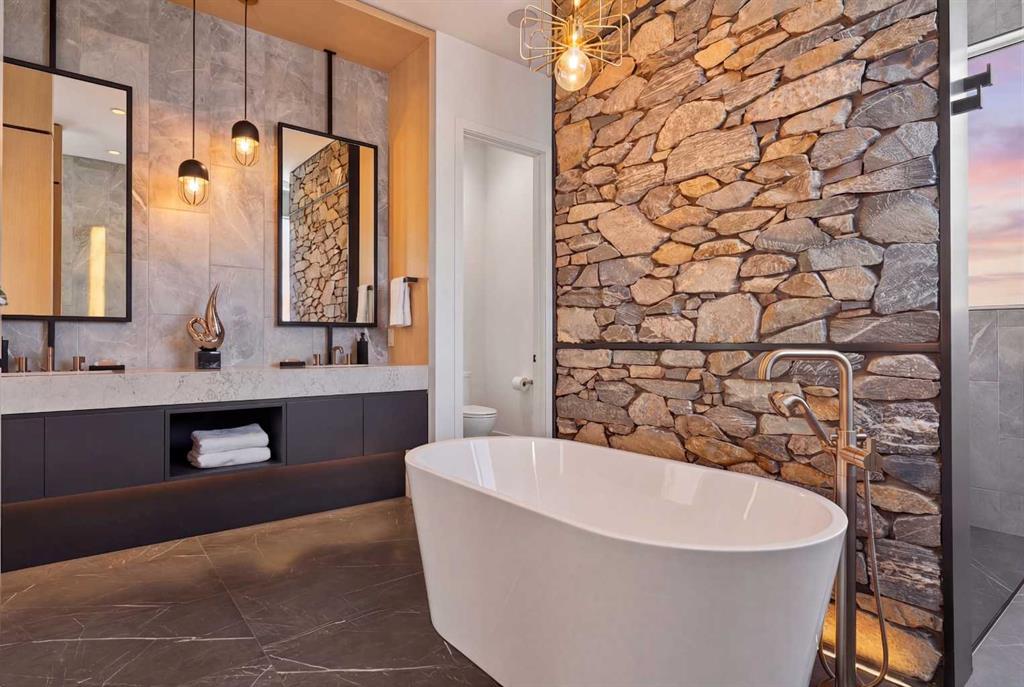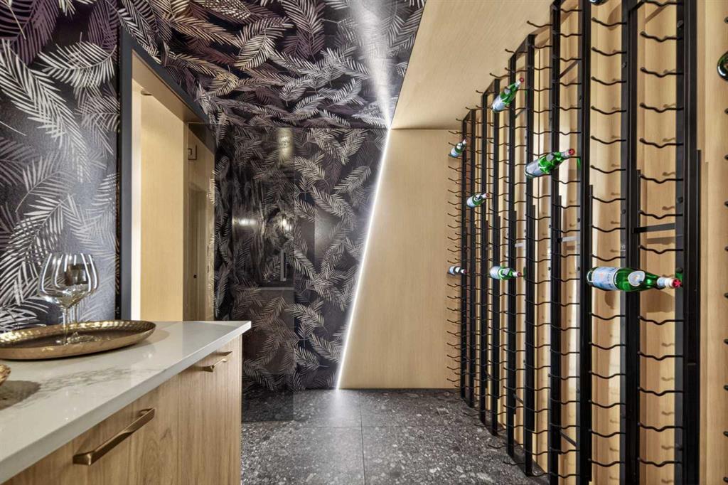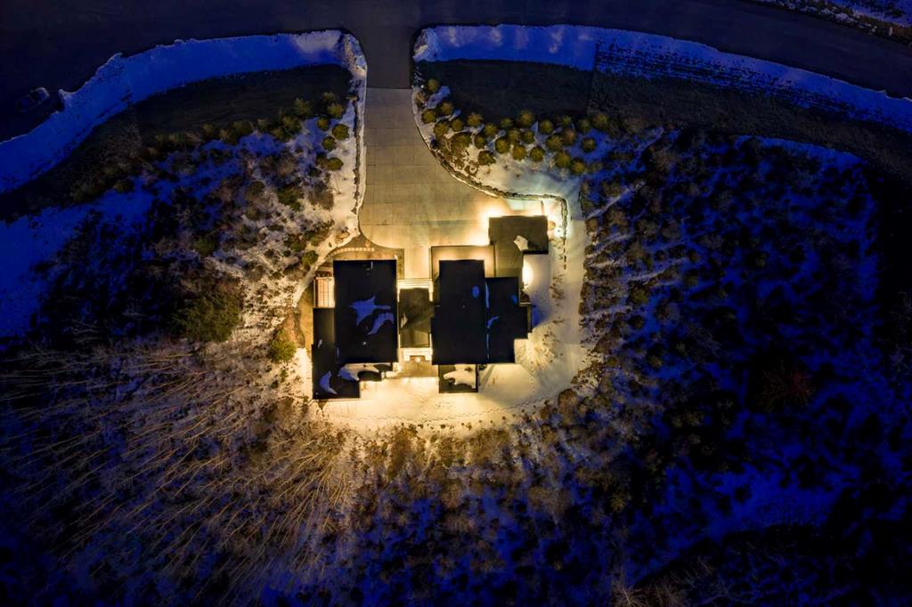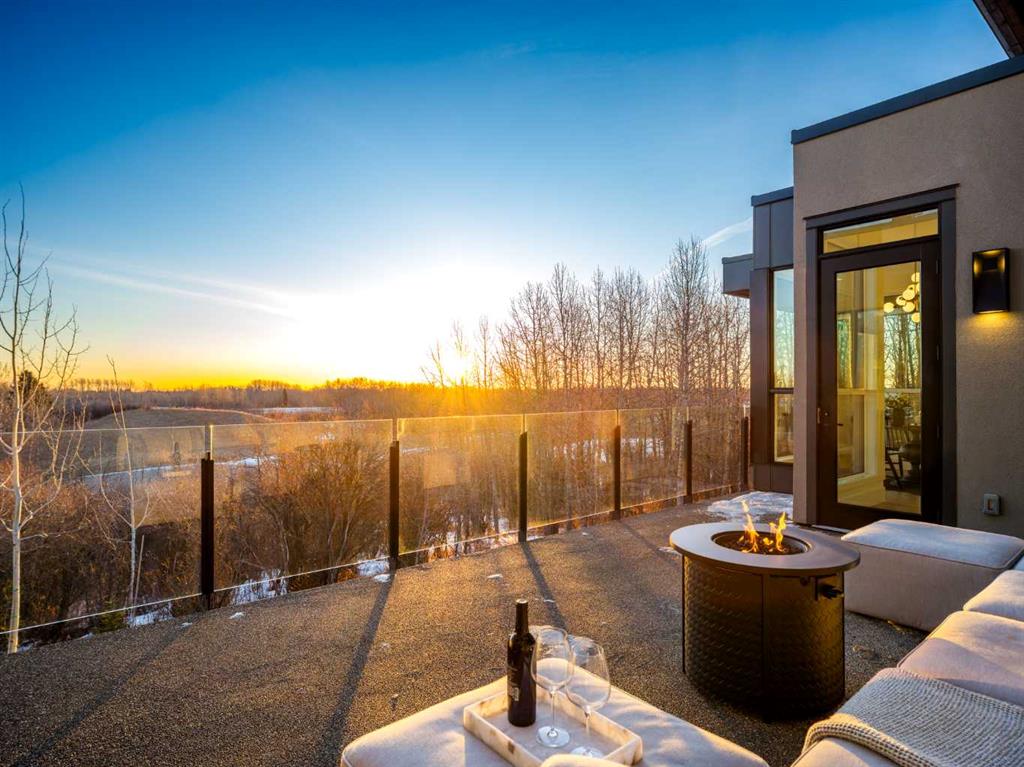 Tucked into 1.77 acres of rolling hills and mature trees in the estate community of Silverhorn, 105 Silverhorn Ridge quietly redefines the acreage category. Built by award-winning West Ridge Fine Homes, this two-storey walkout offers nearly 7,000 SF across three levels — architectural, warm, and connected to nature. The main floor opens to 14' ceilings in the great room, where three elevations of floor-to-ceiling windows in a post-and-beam grid frame the landscape and pour in S/SW light. A linear gas fireplace with metal-paneled facade and stacked ledgestone columns anchors the room. The kitchen is purpose-built for entertaining: a full Miele package with eight-burner dual-oven gas range, paneled built-in fridge and freezer, and dishwasher; black leathered stone counters with waterfall-edge island; full-height marbled stone backsplash; and integrated pantry. The butler's pantry adds a Miele coffee machine, combi-steam oven, and 100+ bottle wine fridge. The dining room sits in a glass enclosure that feels like eating among the trees; the breakfast nook is built for unhurried mornings. Three decks extend the main floor outdoors: a covered patio with BBQ hookup, a pergola sundeck with S/SW exposure, and a central sunrise deck off the nook, foyer, and primary suite. The main-floor primary retreat features a custom built-in bed frame and floor-to-ceiling headboard with tufted velvet, custom millwork, antiqued mirror panels, integrated pendants, and hidden motorized footboard TV. A glass wall delivers light from two elevations with direct deck access. The spa ensuite offers in-floor heat, freestanding soaker tub, floating dual vanity, dedicated makeup vanity, oversized curbless shower with black-framed tinted glass and five-function system, and separate water closet. The walk-in connects to the laundry. An open-riser staircase wrapped in windows leads upstairs to two bedrooms with walk-ins and private ensuites, plus a bright executive office with tinted glass feature wall. The walkout lower level is built for entertaining. Radiant in-floor heat runs throughout. A three-sided gas fireplace with shelving separates the conversation area from a striking wet bar in Japanese charred wood cladding with stainless kegerator, wine fridge, and dishwasher. The space steps down through a games area into a sunken theatre with quartz projection screen, ceiling-mounted projector, and surround sound. Two more bedrooms with private ensuites and walk-ins, a spa bath with steam shower, a gym, and a wine cellar that steals the show round out the level. The heated, epoxy-floored triple-door garage fits up to five cars (or three plus workshop), with ceiling height for a lift. Additional features: metal frame structure, natural stone accents, smart home automation, automated roller shades, irrigation, exterior lighting, stamped concrete driveway, frameless tempered glass railings, speaker zones, and STEP septic. Book a showing to experience 105 Silverhorn Ridge — and Silverhorn itself.
