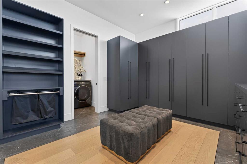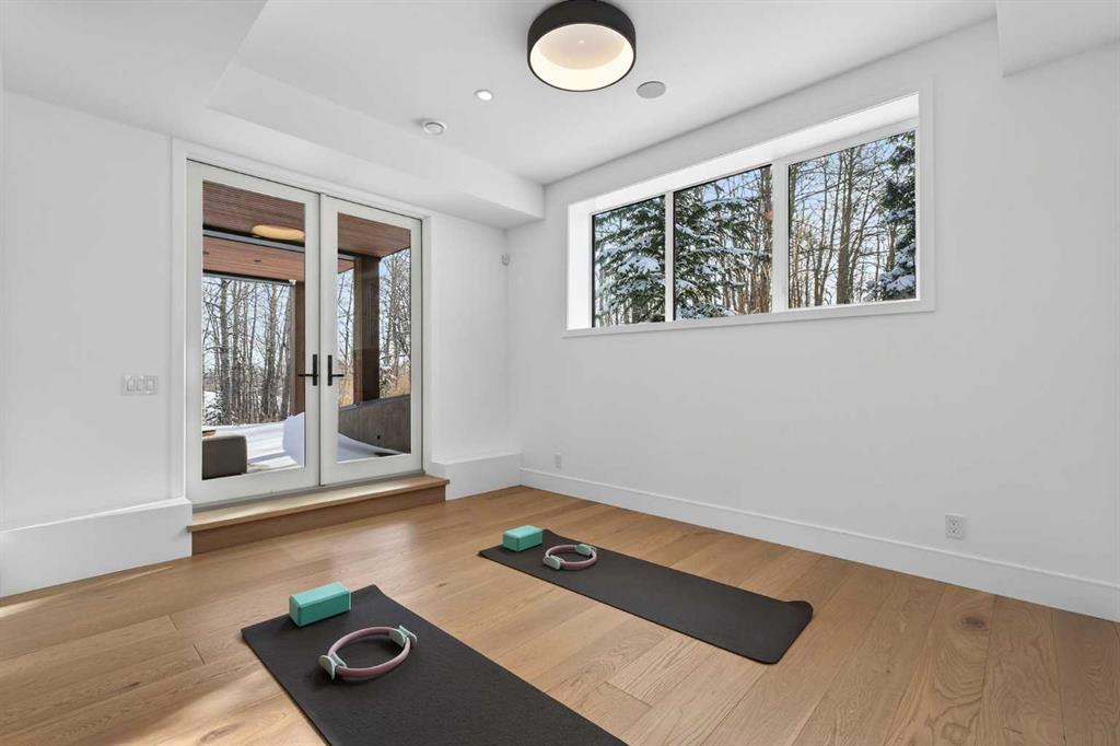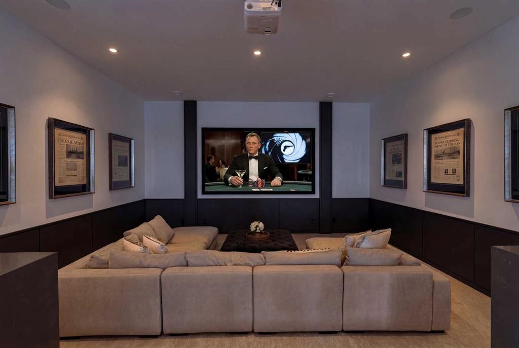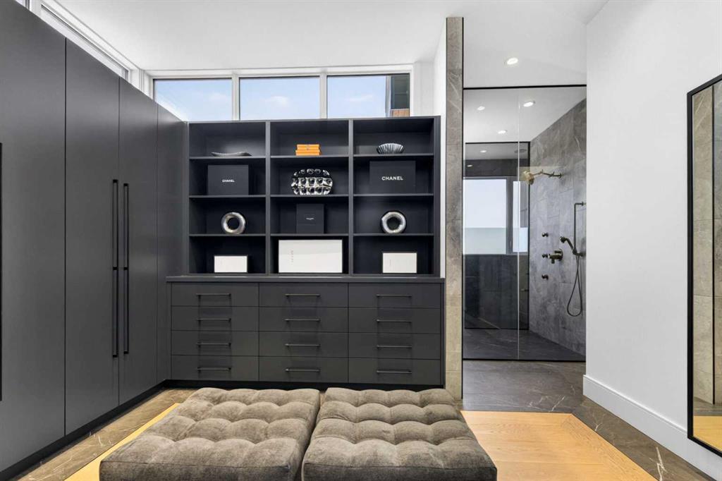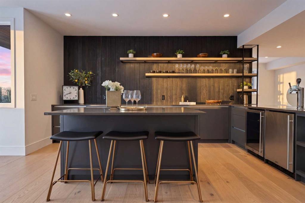 Tucked into 1.77 acres of rolling hills and mature trees in the estate community of Silverhorn, 105 Silverhorn Ridge quietly redefines the acreage category. Built by award-winning West Ridge Fine Homes, this two-storey walkout offers nearly 7,000 SF across three levels — architectural, warm, and connected to nature. The main floor opens to 14' ceilings in the great room, where three elevations of floor-to-ceiling windows in a post-and-beam grid frame the landscape and pour in S/SW light. A linear gas fireplace with metal-paneled facade and stacked ledgestone columns anchors the room. The kitchen is purpose-built for entertaining: a full Miele package with eight-burner dual-oven gas range, paneled built-in fridge and freezer, and dishwasher; black leathered stone counters with waterfall-edge island; full-height marbled stone backsplash; and integrated pantry. The butler's pantry adds a Miele coffee machine, combi-steam oven, and 100+ bottle wine fridge. The dining room sits in a glass enclosure that feels like eating among the trees; the breakfast nook is built for unhurried mornings. Three decks extend the main floor outdoors: a covered patio with BBQ hookup, a pergola sundeck with S/SW exposure, and a central sunrise deck off the nook, foyer, and primary suite. The main-floor primary retreat features a custom built-in bed frame and floor-to-ceiling headboard with tufted velvet, custom millwork, antiqued mirror panels, integrated pendants, and hidden motorized footboard TV. A glass wall delivers light from two elevations with direct deck access. The spa ensuite offers in-floor heat, freestanding soaker tub, floating dual vanity, dedicated makeup vanity, oversized curbless shower with black-framed tinted glass and five-function system, and separate water closet. The walk-in connects to the laundry. An open-riser staircase wrapped in windows leads upstairs to two bedrooms with walk-ins and private ensuites, plus a bright executive office with tinted glass feature wall. The walkout lower level is built for entertaining. Radiant in-floor heat runs throughout. A three-sided gas fireplace with shelving separates the conversation area from a striking wet bar in Japanese charred wood cladding with stainless kegerator, wine fridge, and dishwasher. The space steps down through a games area into a sunken theatre with quartz projection screen, ceiling-mounted projector, and surround sound. Two more bedrooms with private ensuites and walk-ins, a spa bath with steam shower, a gym, and a wine cellar that steals the show round out the level. The heated, epoxy-floored triple-door garage fits up to five cars (or three plus workshop), with ceiling height for a lift. Additional features: metal frame structure, natural stone accents, smart home automation, automated roller shades, irrigation, exterior lighting, stamped concrete driveway, frameless tempered glass railings, speaker zones, and STEP septic. Book a showing to experience 105 Silverhorn Ridge — and Silverhorn itself.