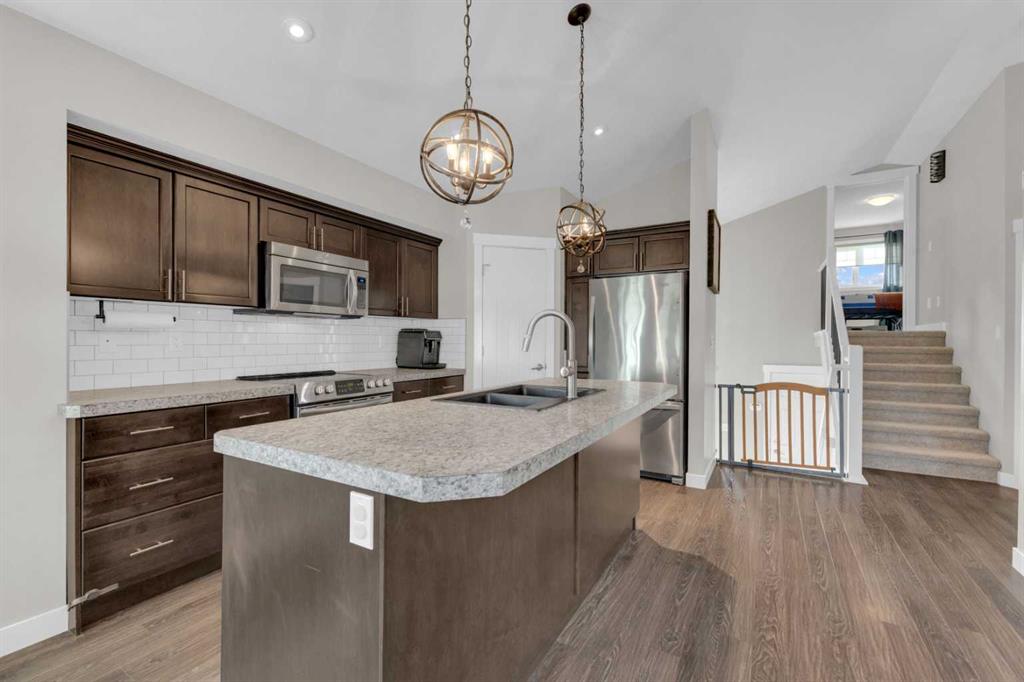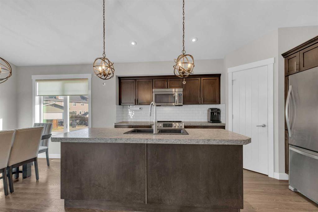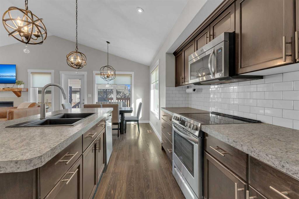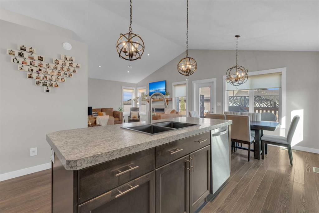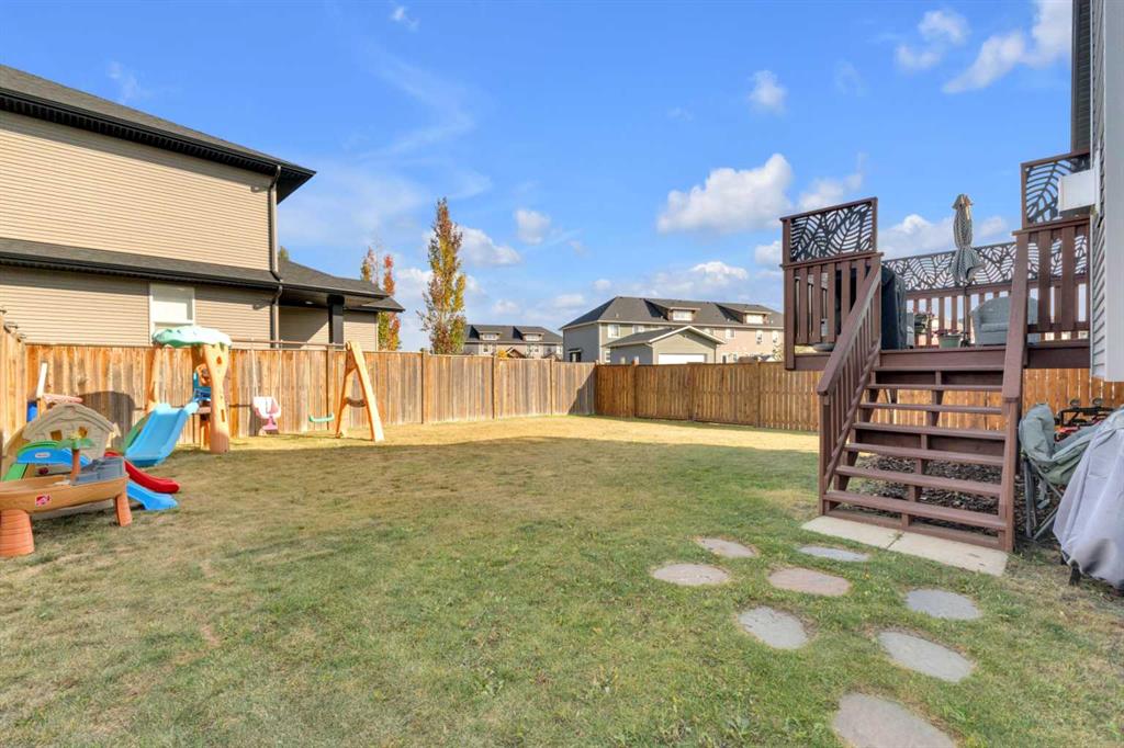 Cozy and comfortable, this beautiful modified bi-level in Ryders Ridge offers the perfect blend of style and functionality. Ideally located just moments from trails, parks, schools, and amenities, it’s a home designed for both convenience and everyday living. The open concept main floor showcases a spacious living room with a gas fireplace and plenty of room for a large sectional. Adjacent to the living room is a dining area with garden doors that lead to a private deck featuring full privacy screens, overlooking the fenced yard with an RV gate. The kitchen is sure to impress with its large island with seating, stainless steel appliances, corner pantry with built-in solid shelving, full tile backsplash, and updated lighting. Also on the main floor is a bedroom and full bathroom. Upstairs, the master retreat awaits with a walk-in closet and luxurious 5-piece ensuite. The fully finished basement offers large windows, a bright family room, an additional bedroom, full bathroom, and generous storage space. Additional highlights include a new washer and dryer (2024), a new hot water tank (2024), a high-efficiency furnace, and a finished attached garage with gas rough-in for a heater.